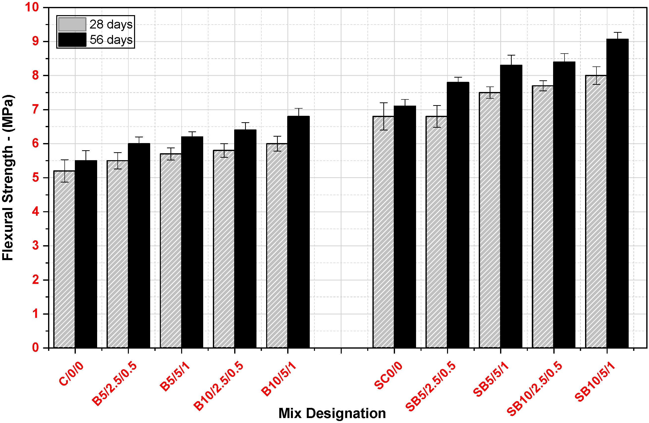 - According to mechanical and flexural strength improvement, sisal fibers effectively enhanced flexural strength through mechanical crack bridging, while bacterial incorporation contributed additional gains through MICP. The combined system (SB-series) showed the most pronounced improvement, with SB10/5/1 exhibiting a 67% increase in flexural strength at 56 days compared to the control.