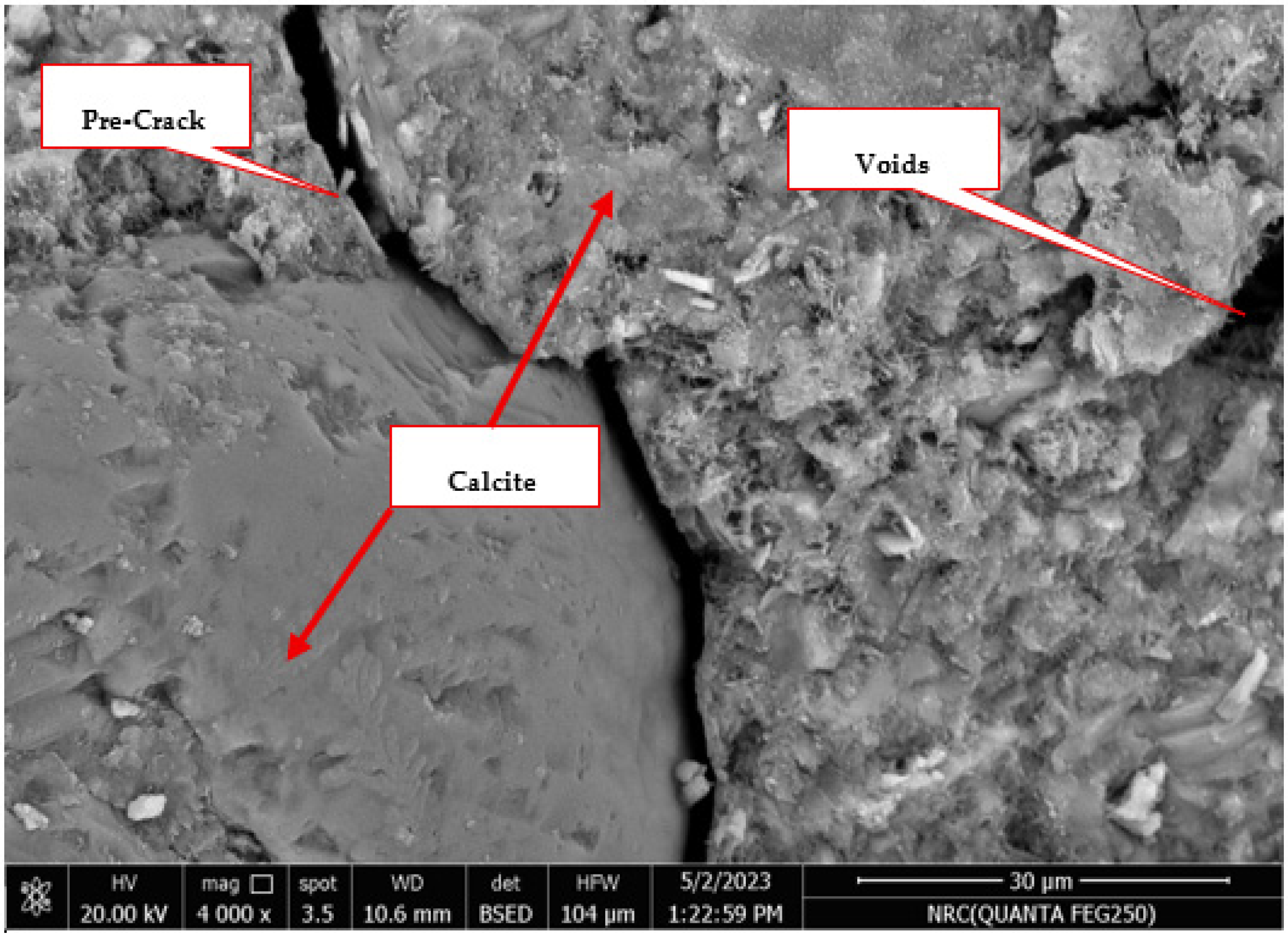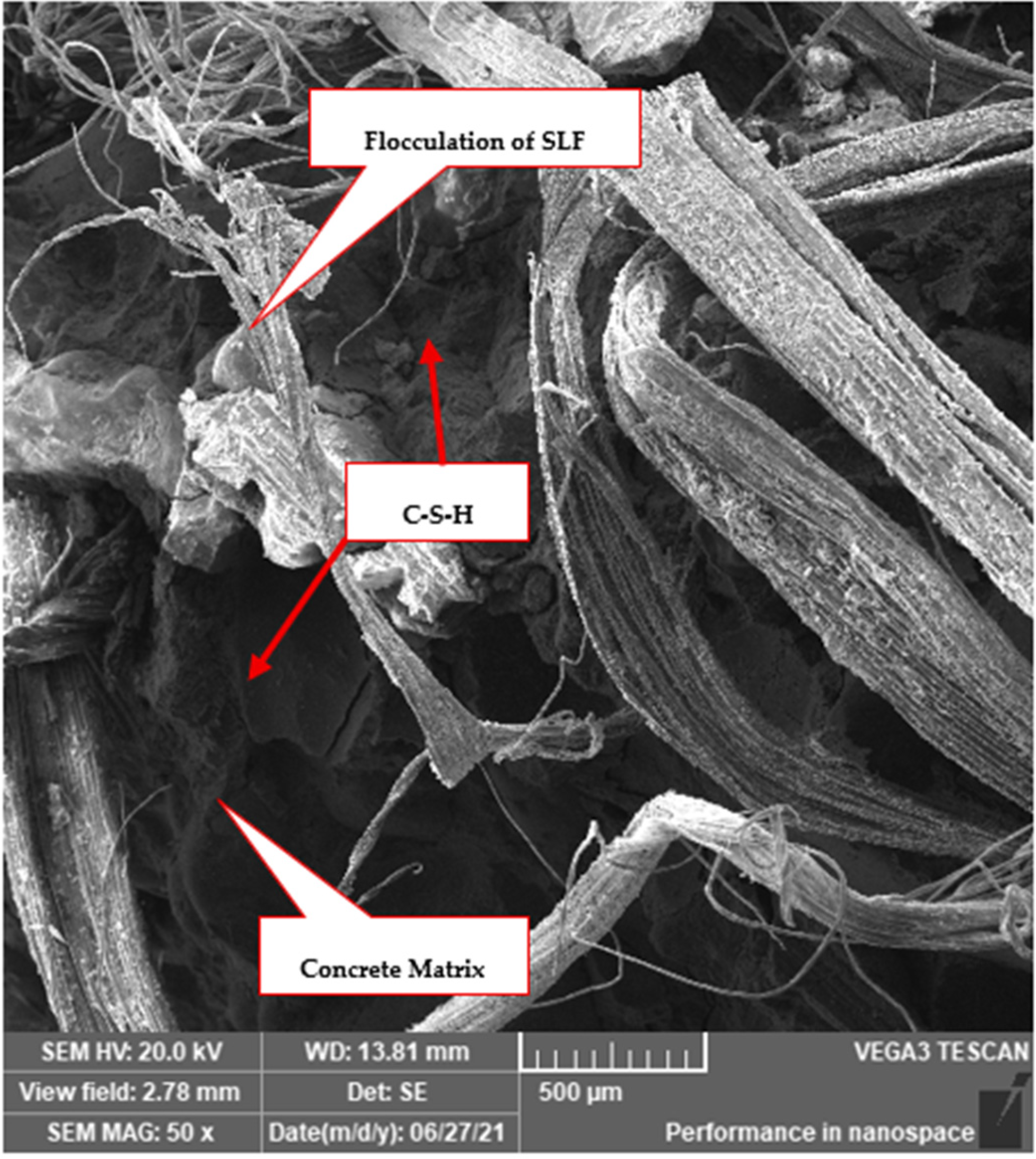 - The microstructural analysis at 56 days confirmed that incorporating raw, untreated sisal fibers alongside Bacillus subtilis and calcium lactate significantly enhanced the self-healing efficiency of the concrete. Fiber bridging-maintained crack widths within the optimal MICP range, while the natural micro-roughness of sisal provided nucleation sites that promoted denser CaCO3 precipitation. This synergistic mechanism—validated by higher Ca content (24.39%) and Ca/Si ratios in SB10/5/1—resulted in superior microstructural densification and improved compressive strength recovery compared to bacterial healing alone.