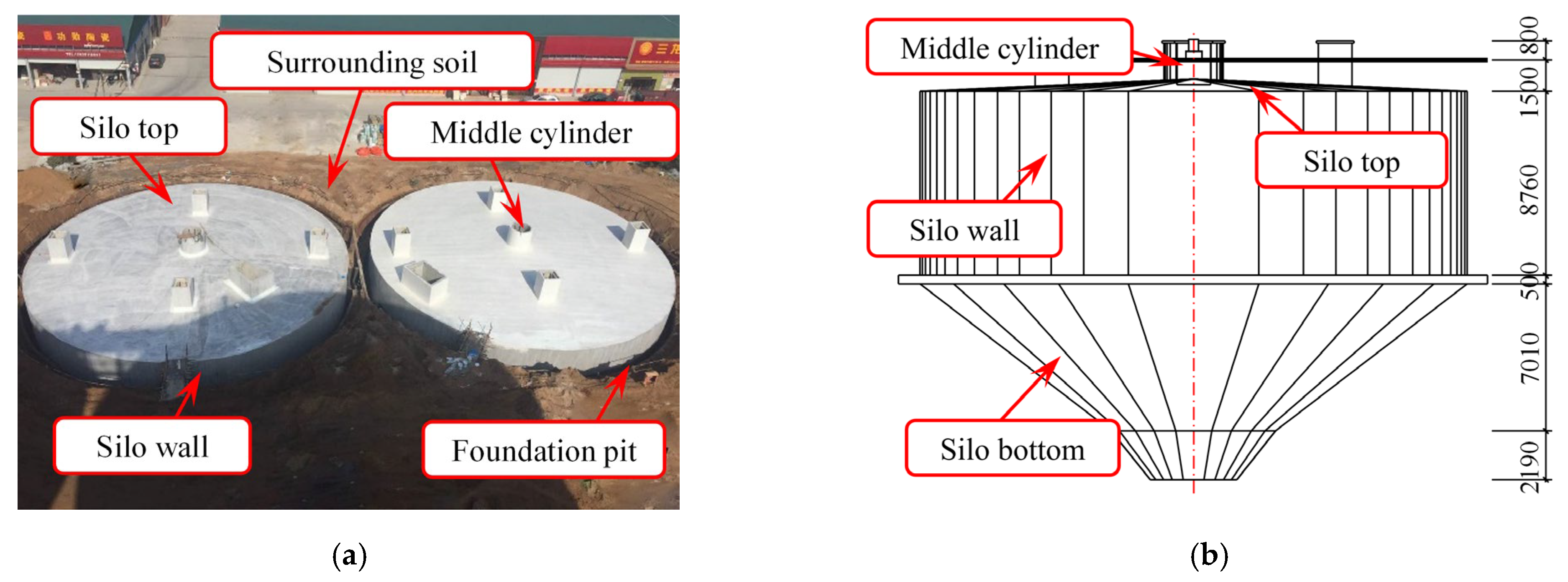 - Jin, L.; Liang, X.; Huo, C.; Wang, Z.; Wang, Z. Engineering test and numerical analysis of underground concrete silo. J. Civ. Environ. Eng. 2020, 42, 40–45. [Google Scholar]