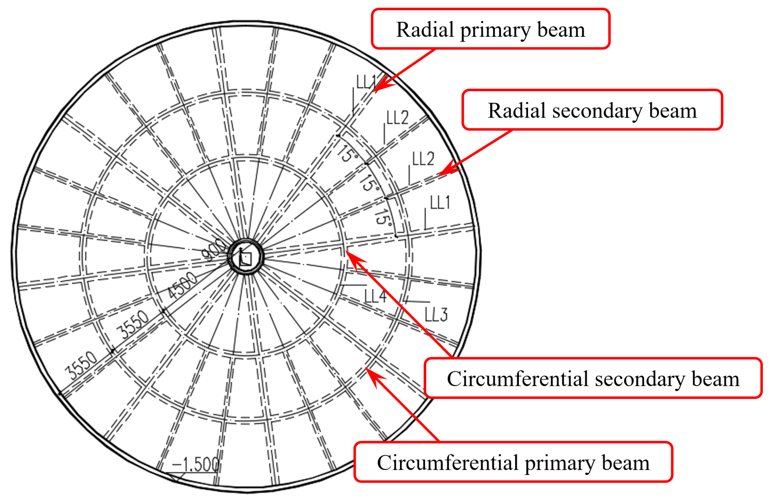- In the FE analysis of RC underground silo structures, the locations of maximum stress and deformation in the structural system are both at the bottom of the mid-span section of the radial primary beam. The maximum von Mises stress and beam deflection are 13.4 MPa and 4.27 mm, respectively.