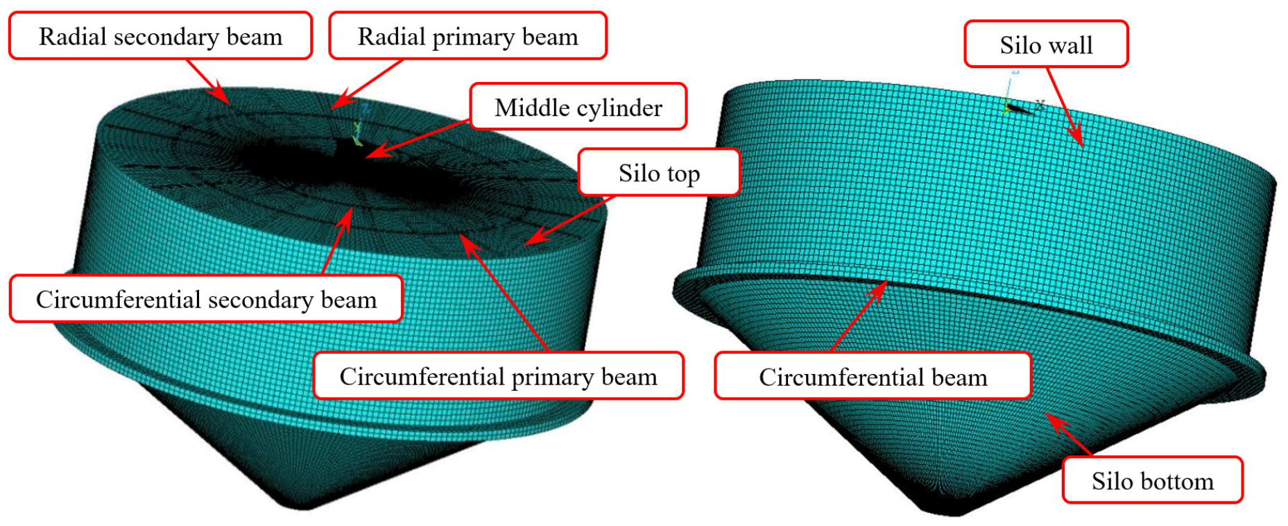 - Balkaya, C.; Kalkan, E.; Yuksel, S.B. Finite element analysis and practical modeling of reinforced concrete multi-bin circular silos. ACI Struct. J. 2006, 103, 365–371. [Google Scholar] [CrossRef]