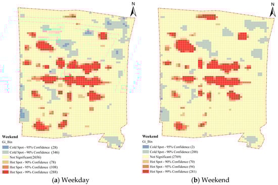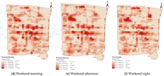 - Construction of multi-temporal average vitality levels: To reflect the temporal rhythms of daily life, tourism activities, and consumption behaviors in the historic urban area, this study divided the hourly vitality data from 8:00 to 23:00 daily into four typical periods: morning (8:00–12:00), afternoon (13:00–18:00), evening (19:00–23:00), and all-day (8:00–23:00). The vitality value for each spatial unit was then averaged across each time period, as shown in Equation (1):where represented the KDE vitality value for the grid at hour , denoted the average vitality value for the period , and indicated the number of hours within the period.