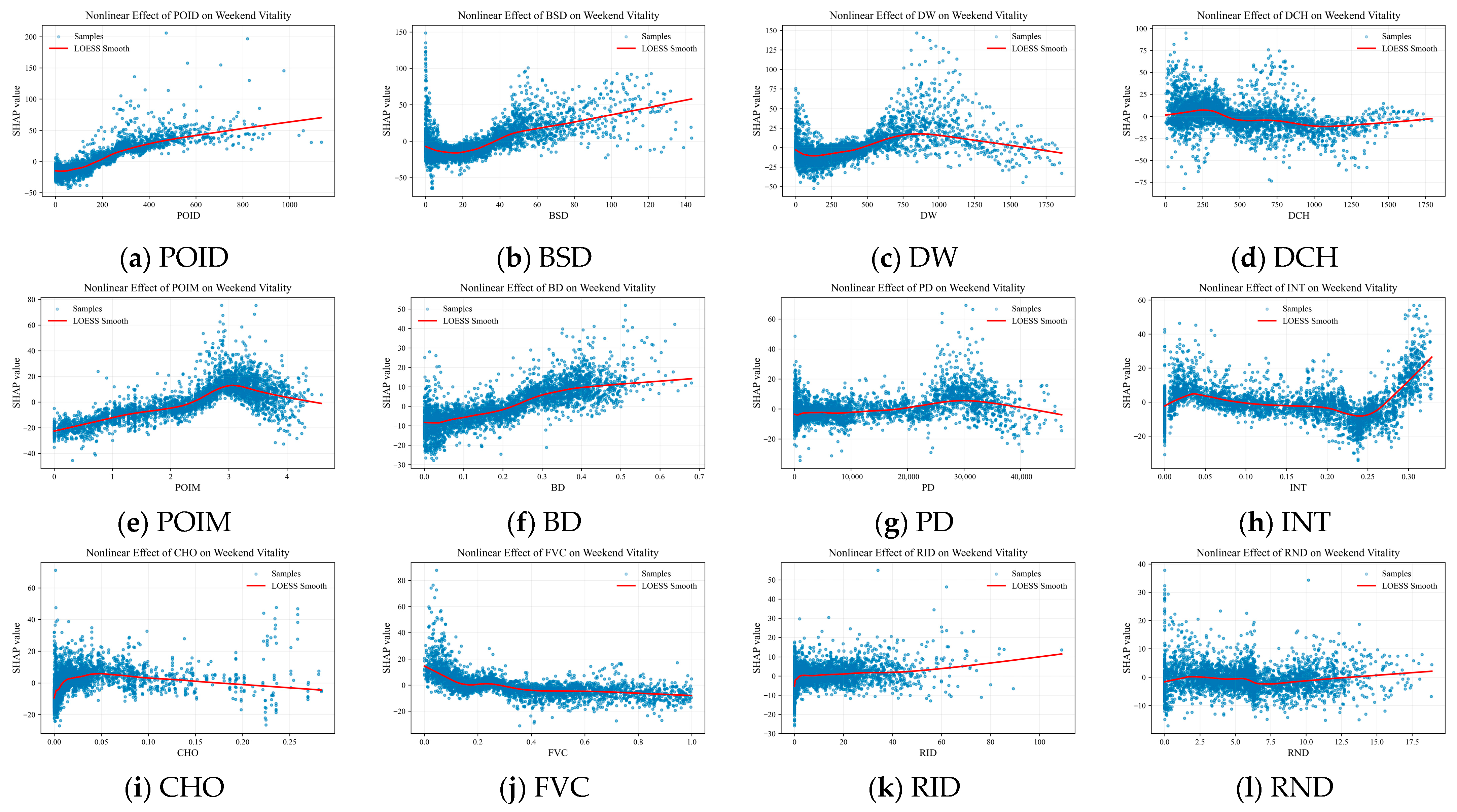 | Dimension | Influencing Factors | Weekday | Weekend | ||||||