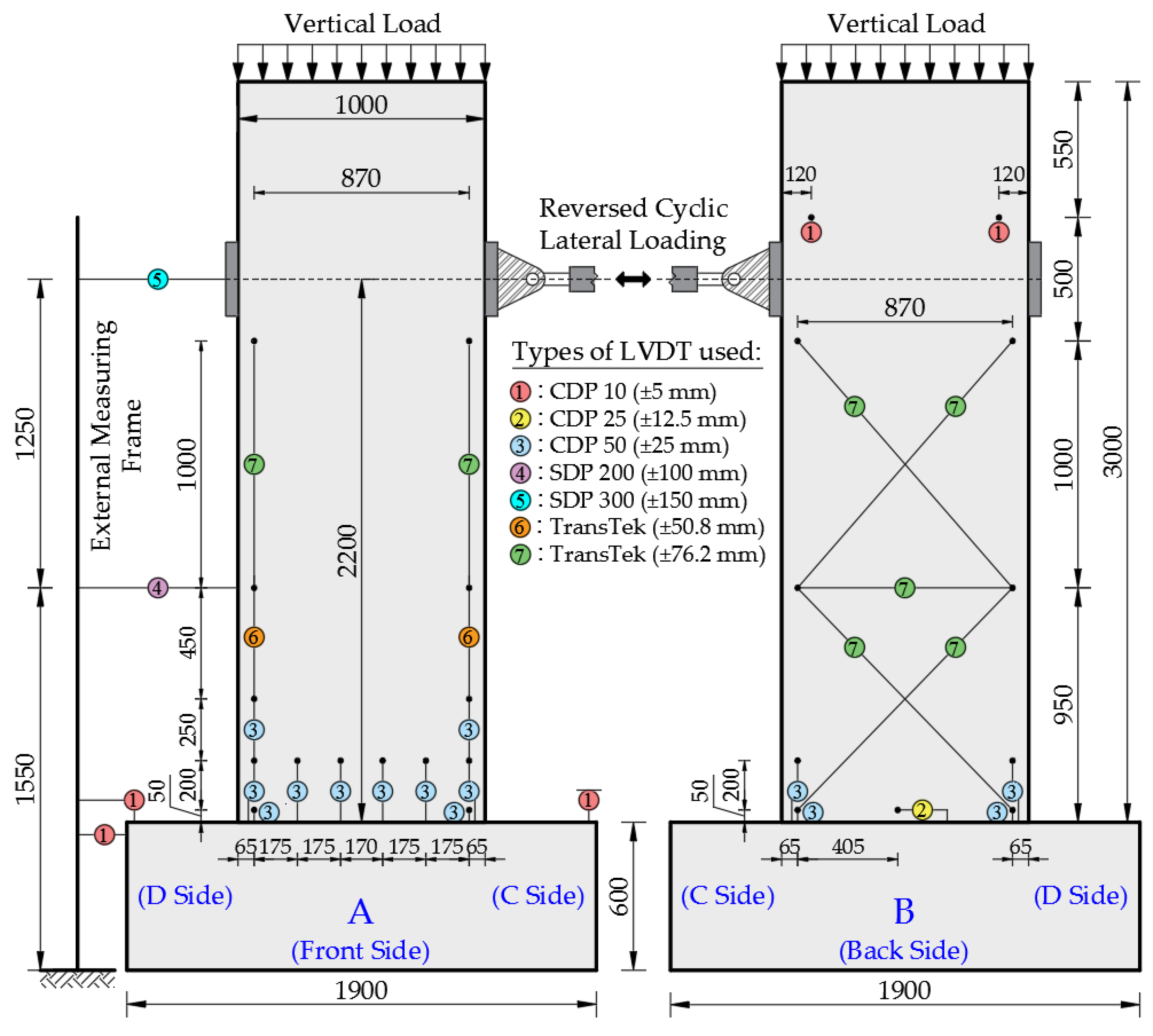 - Tran, T.A.; Wallace, J.W. Experimental Study of Nonlinear Flexural and Shear Deformations of Reinforced Concrete Structural Walls. In Proceedings of the 15th World Conference on Earthquake Engineering, Lisboa, Portugal, 24–28 September 2012. [Google Scholar]