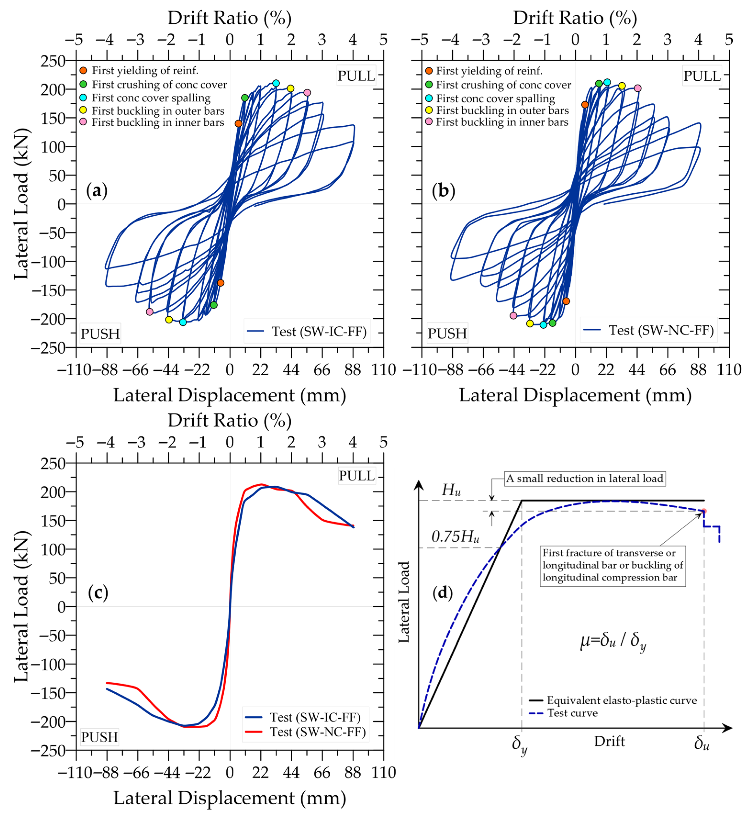 - Failure in both specimens occurred through longitudinal bar buckling accompanied by crushing of the concrete core. Ultimate drift ratios were 2.0% for SW-IC-FF and 1.50% for SW-NC-FF, corresponding to displacement ductility values of 4.0 and 4.3, respectively. The SW-IC-FF specimen, detailed with insufficient boundary transverse reinforcement, exhibited a slightly greater drift capacity. Concrete crushing in each specimen began in the form of toe crushing just above the W–P interface and subsequently propagated upward.
