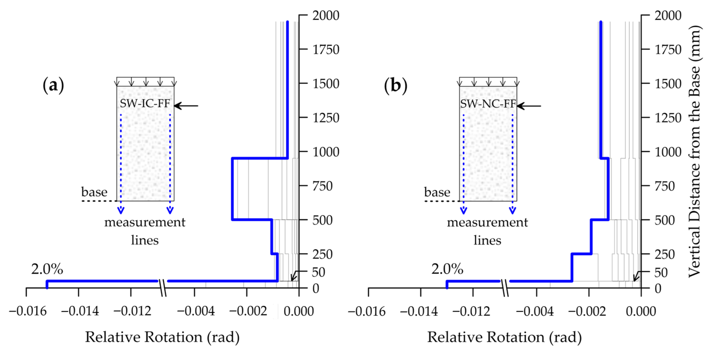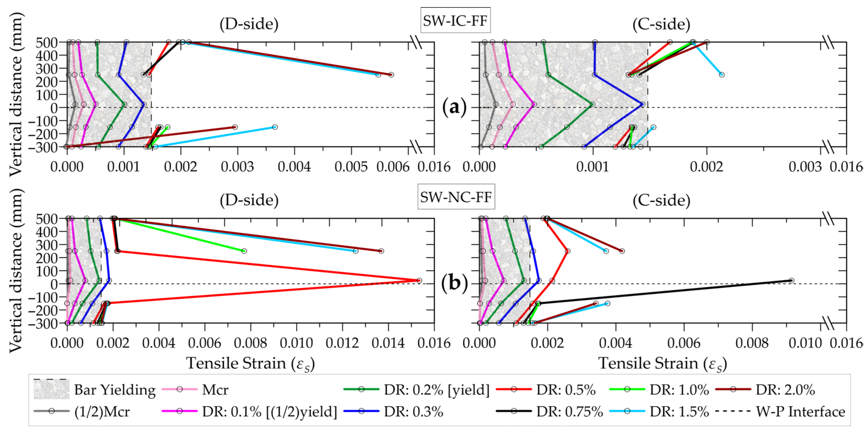 - Both the SW-IC-FF and SW-NC-FF specimens predominantly exhibited flexural-dominated behavior. In each specimen, a principal crack initiated at the W–P interface and progressively widened as the drift ratio increased during the test. Yielding of the longitudinal boundary reinforcement was observed at approximately 0.30% drift ratio, with maximum tensile strains of 0.006 in SW-IC-FF and 0.015 in SW-NC-FF. In both specimens, the horizontal web reinforcement did not yield, as expected.