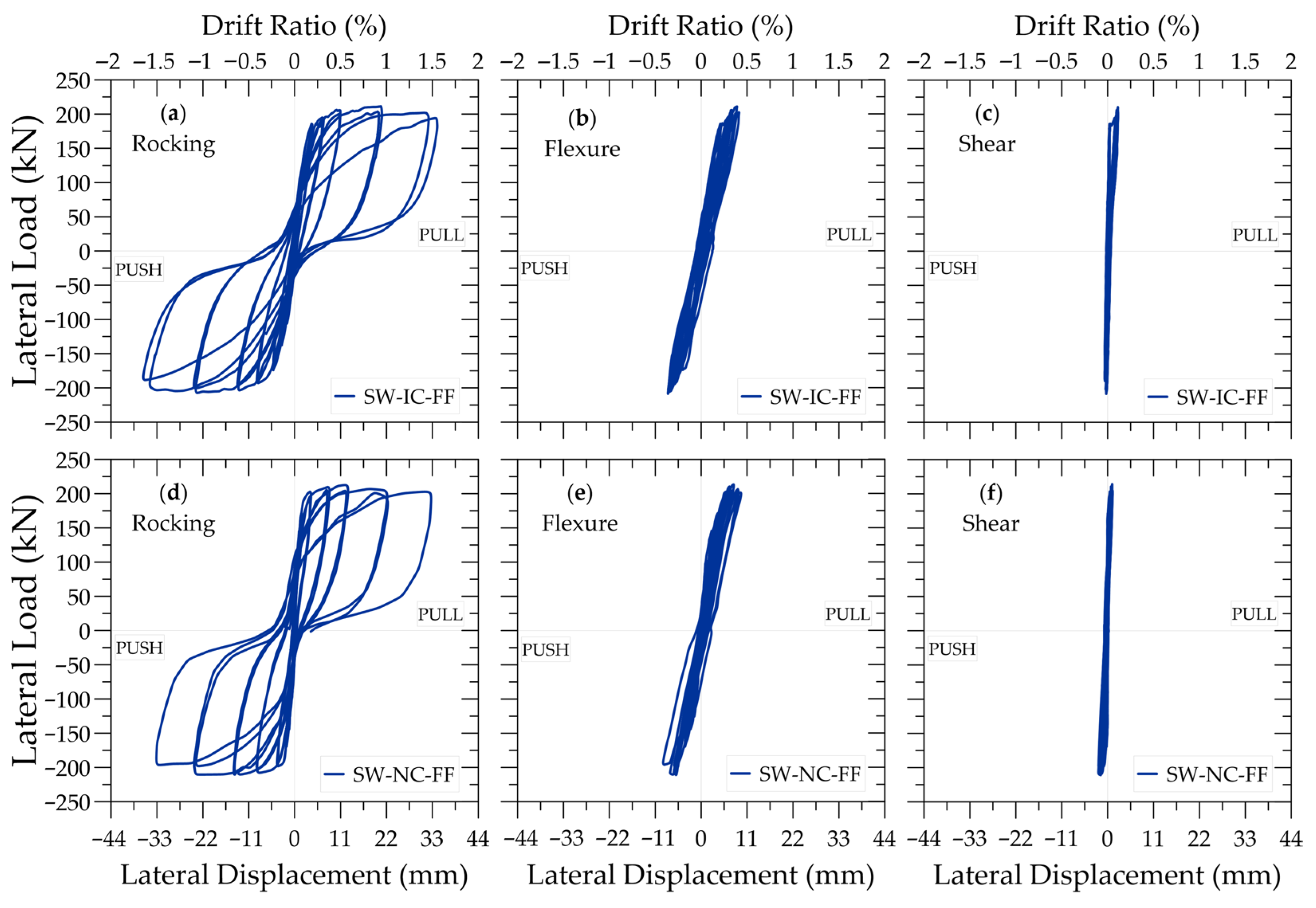 - Rocking response was identified as the predominant mechanism governing both the lateral displacements of the walls and their overall behavior. This response was primarily attributed to the progressive debonding of plain longitudinal reinforcement, occurring not only in the pedestal but also along the wall height. Large W–P interface crack widths, significant interface rotations, and higher concrete tensile strains recorded by LVDTs compared to the reinforcement strains measured by SGs collectively substantiated this mechanism. The pronounced pinching observed in the hysteresis loops further confirmed the self-centering behavior induced by reinforcement debonding and the associated rocking.
