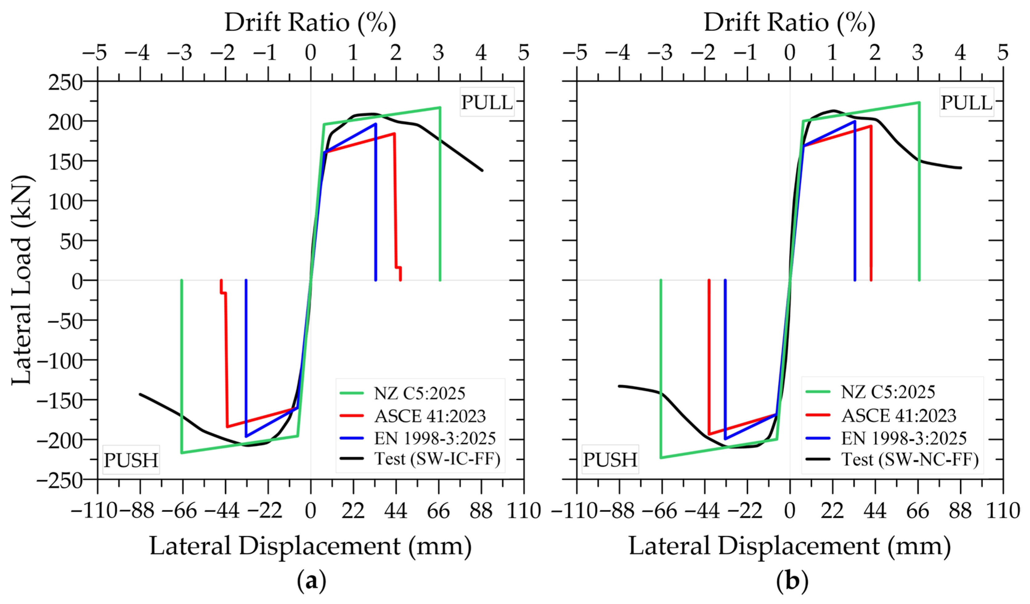 - All three guidelines capture the initial stiffness and yield rotation of the substandard wall specimens with commendable fidelity; however, their predictions of rotation capacity diverge significantly. NZ C5 provides the closest agreement with the experimental results, yet this arises from predicting the same rotation capacity for both specimens, which leads to a distinctly unconservative estimate for specimen SW-NC-FF. ASCE 41 is the only procedure that reflects the slight differences between the specimens, whereas EN 1998-3 remains the most conservative. These findings highlight the need for development of improved assessment procedures that explicitly incorporate the rocking-dominated deformation mechanisms governing walls reinforced with plain longitudinal bars.