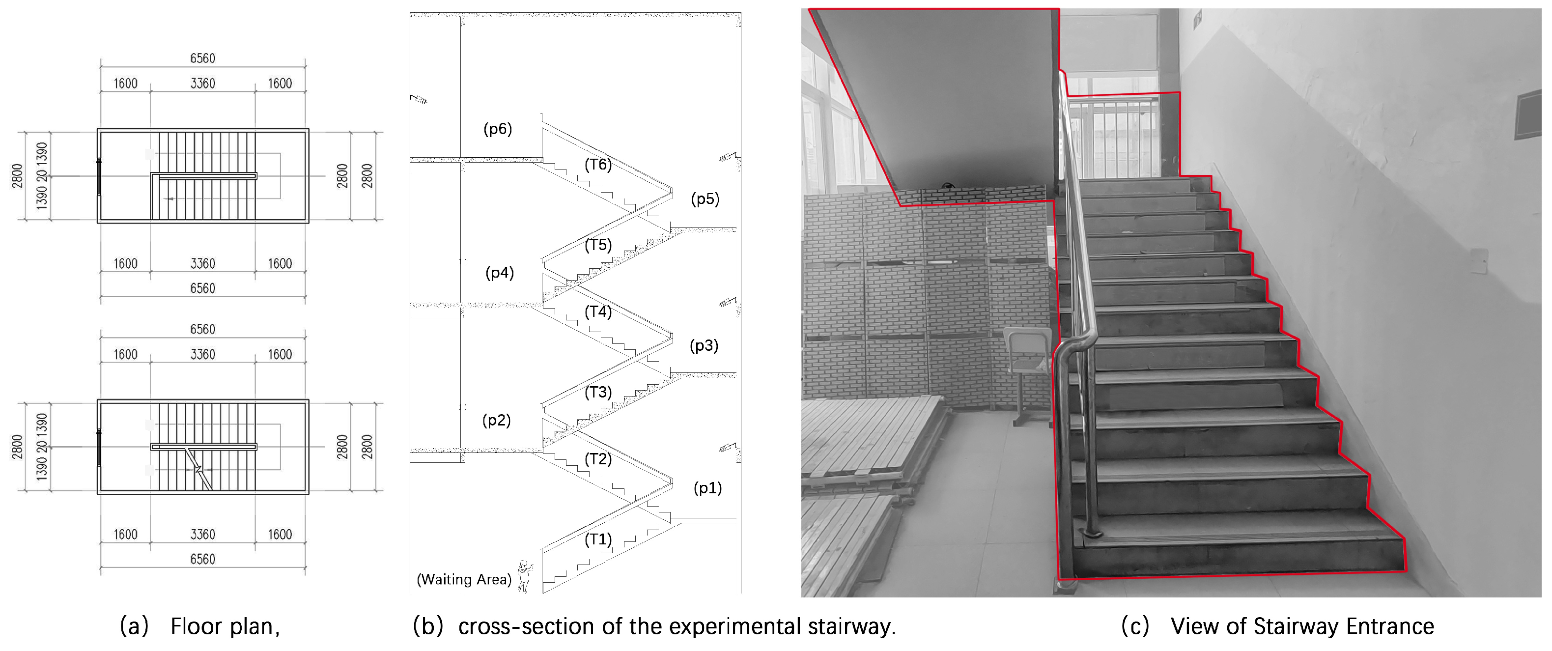 Figure 1, which includes (a) a plan view, (b) a sectional view, and (c) a stair entrance view. During the experiments, surveillance cameras were used to continuously record participants’ entire upward movement. As shown in