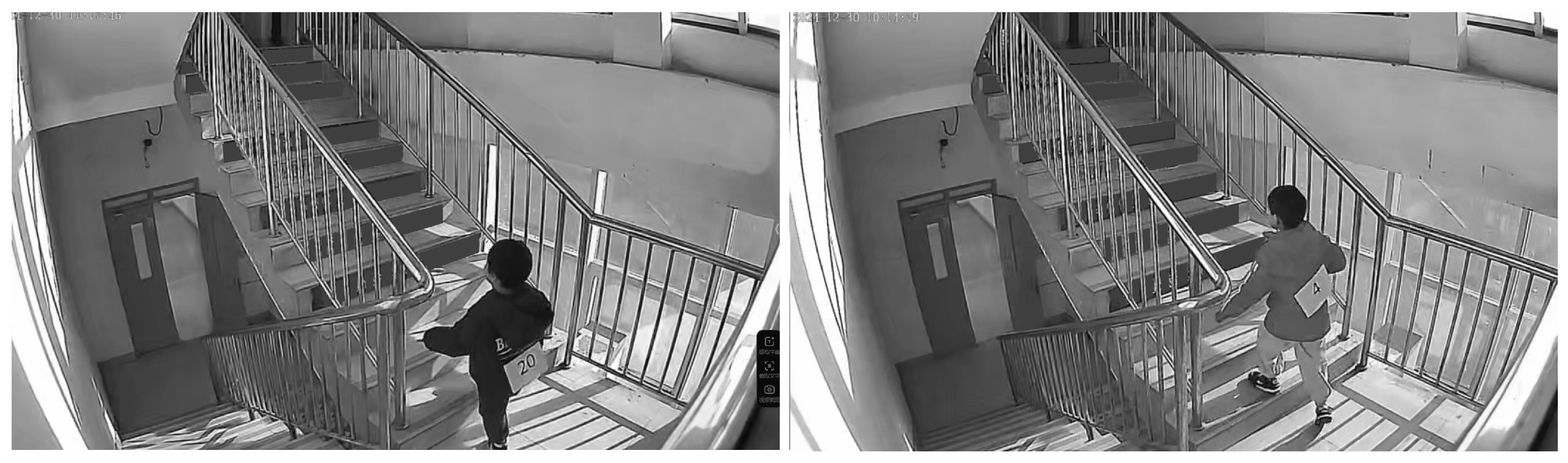 Specifically, each participant first gathered in a designated waiting area and completed a brief resting phase before entering the evacuation route to initiate upward movement. The entire process was recorded continuously using fixed surveillance cameras. Notably, the participants were unfamiliar with the experimental environment, which helped more accurately emulate the uncertainty characteristics of real emergency evacuation scenarios. After each trial, all participants were required to rest for 10 min to mitigate fatigue effects. The overall experimental setup is shown in