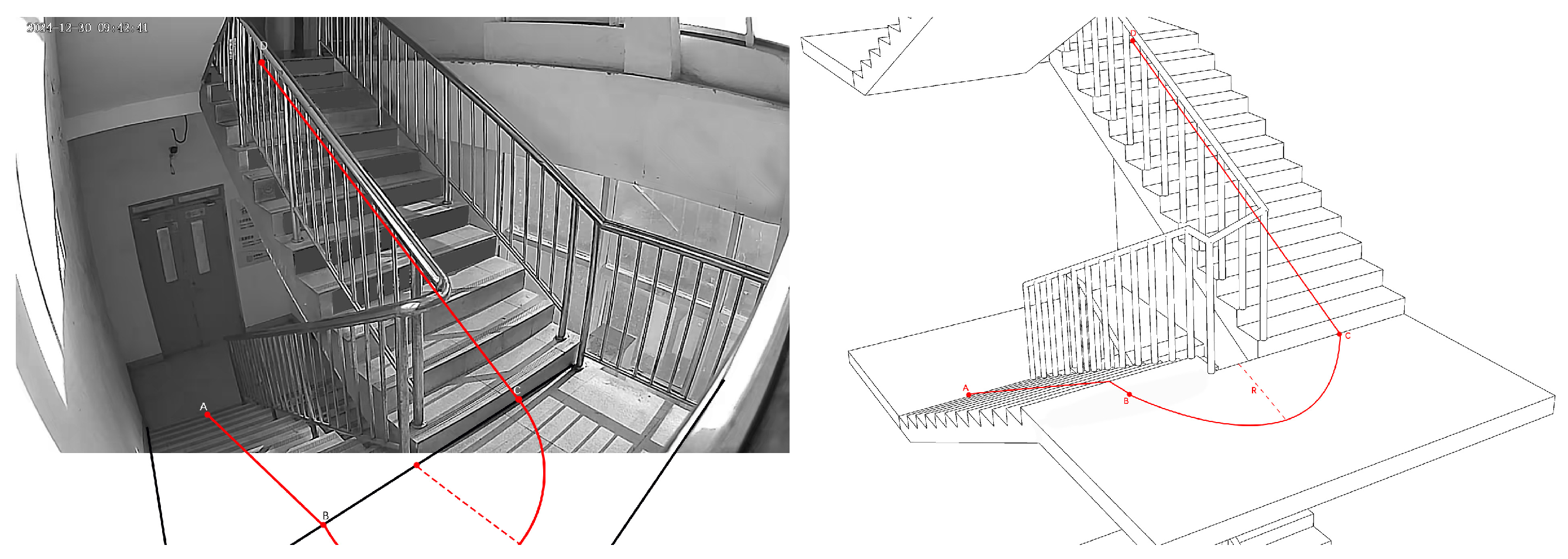 Figure 3. Specifically, A represents the starting point of the first half of the stair flight, B represents the end point of the first half, C represents the starting point of the second half of the stair flight, D represents the end point of the second half, and R denotes the turning radius.