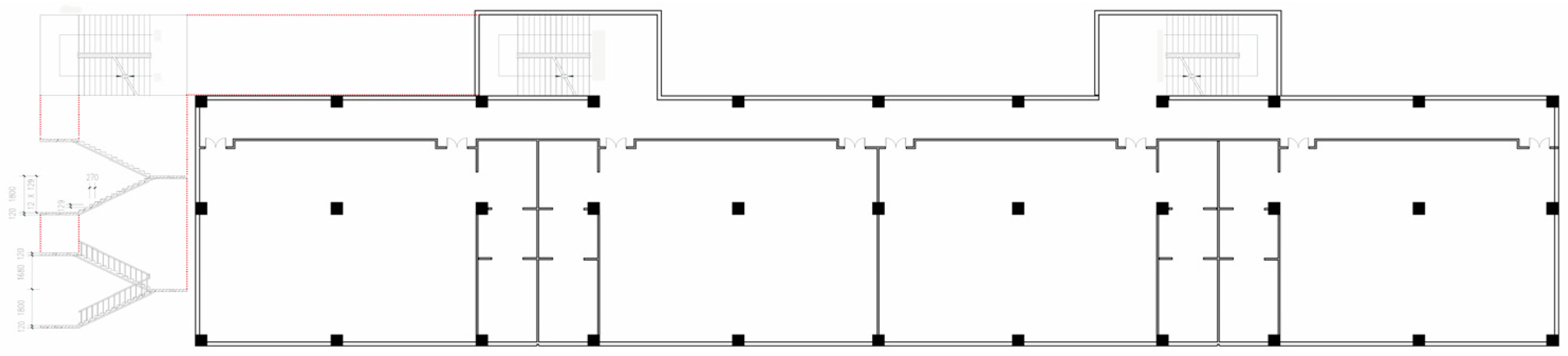 39], with four activity rooms on each floor. Each activity room was equipped with two evacuation exits, each 1.5 m wide. Two internal two-flight staircases served as the primary vertical circulation routes, with detailed specifications presented in