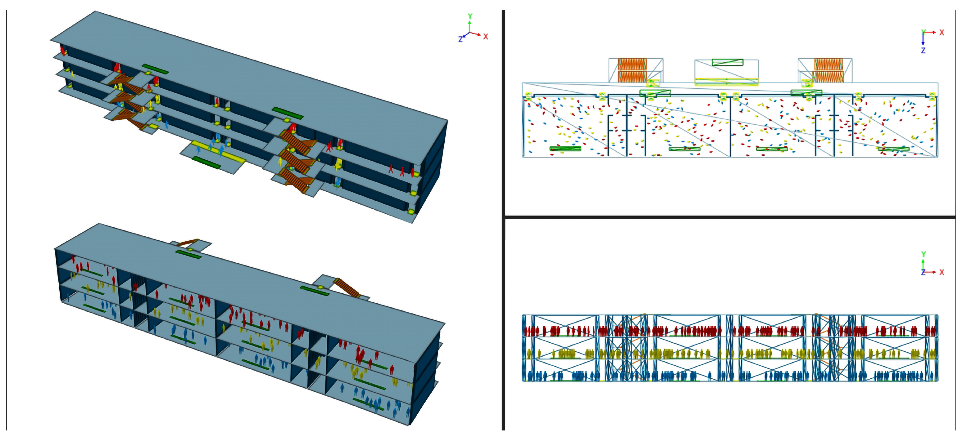 37]. MassMotion supports agent-based dynamic route selection, social force interactions, and responsiveness to environmental changes, enabling effective simulation of realistic behaviors during ascending evacuation [