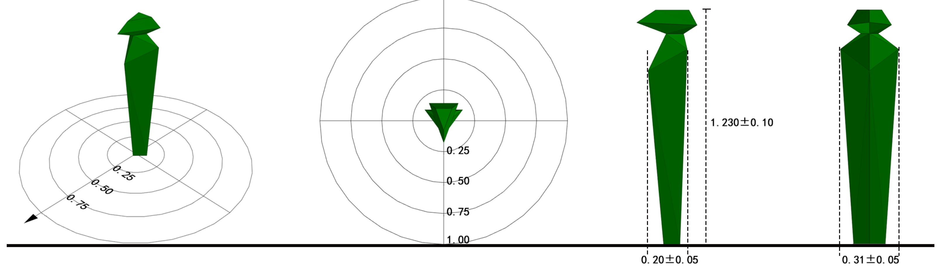 Based on these data and the observed variation range, the children’s height was set to 1230 ± 100 mm, body width to 310 ± 50 mm, and body depth to 200 ± 50 mm in the simulation. To facilitate evacuation simulation in the software, the anthropometric structures of kindergarten children were simplified into corresponding geometric forms in the simulation model, as illustrated in