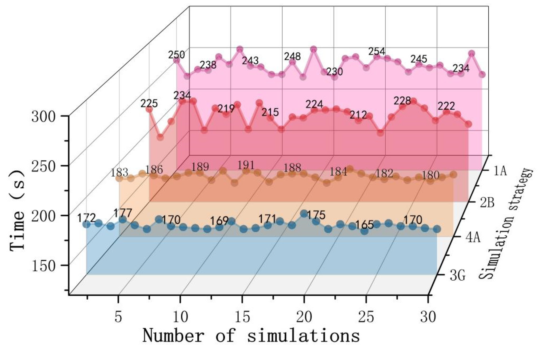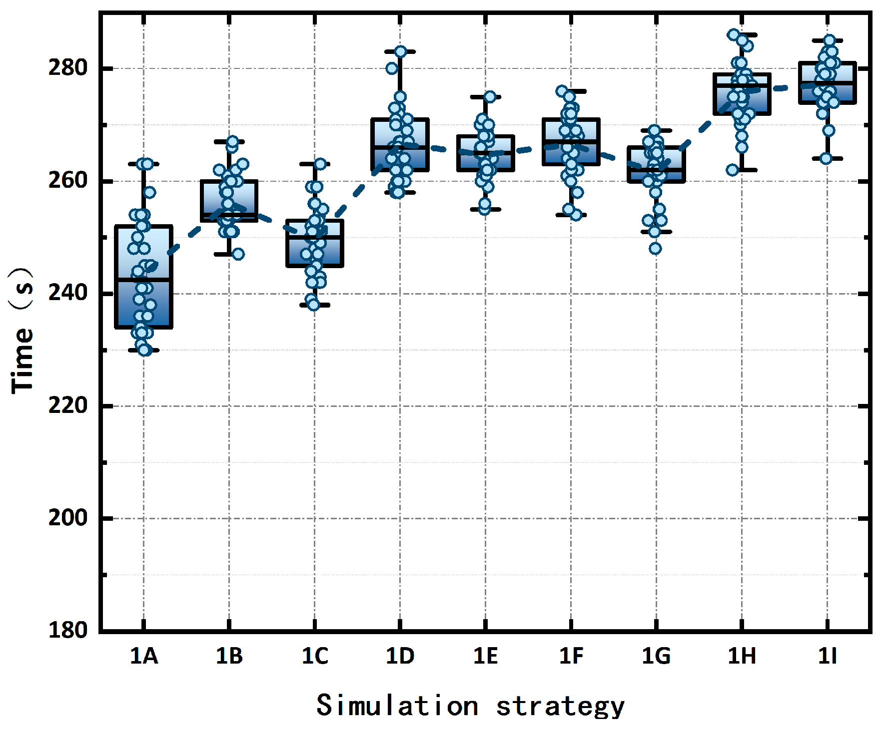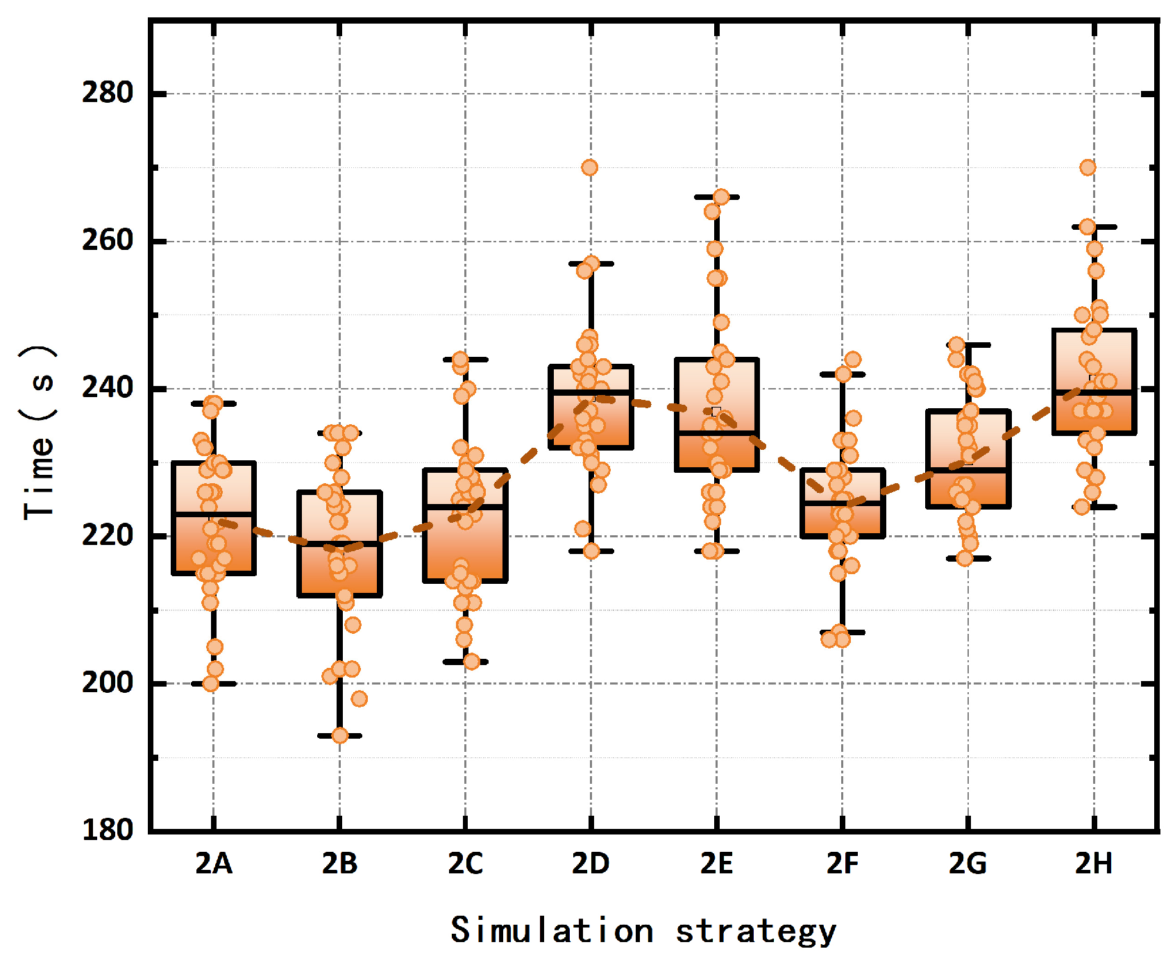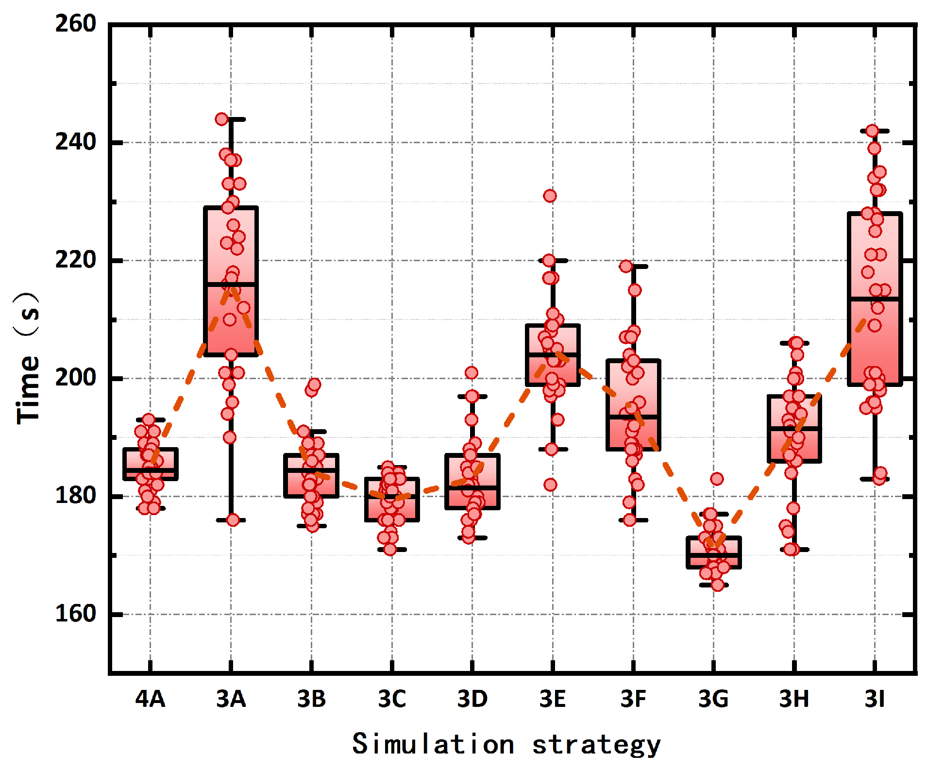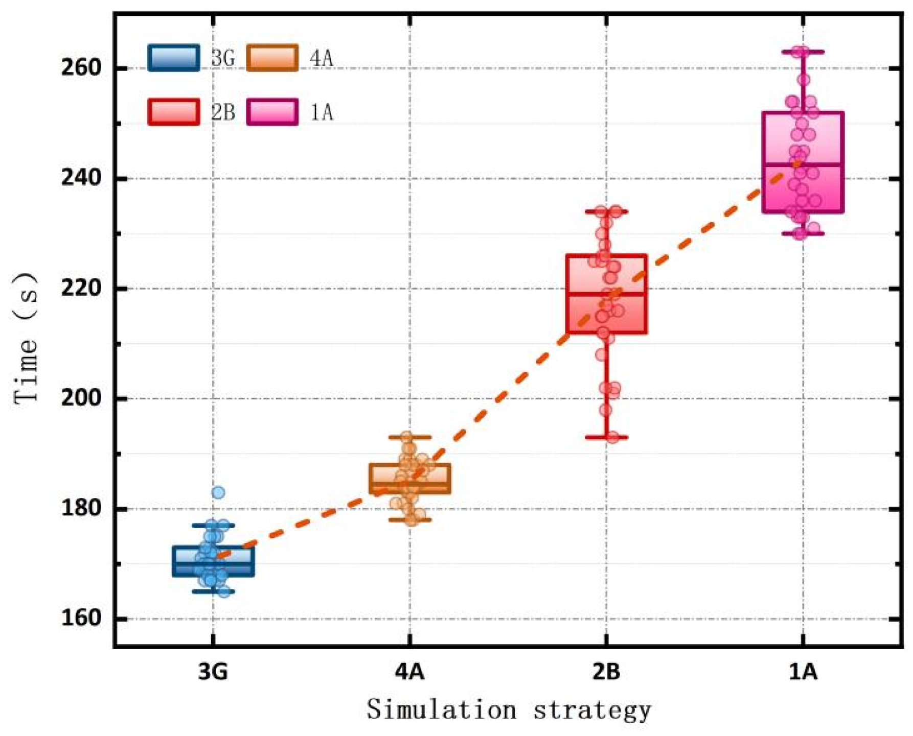 Figure 15), Strategy 3G achieved the shortest average evacuation time and exhibited smooth temporal fluctuations and tightly clustered data points.