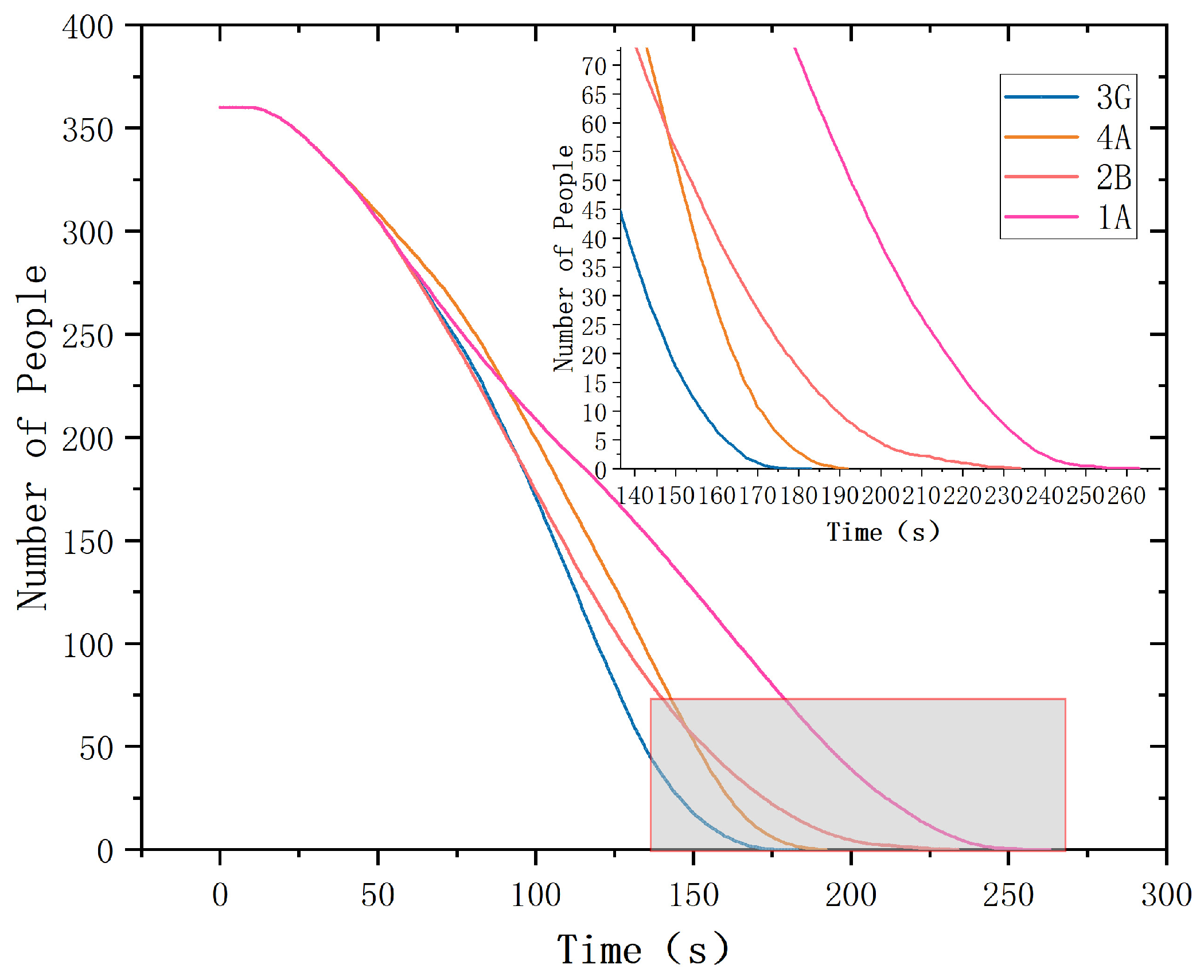 Figure 16 reveal clear time-dependent variations in the effectiveness of the four evacuation strategies. During the initial stage (0–50 s), all strategy curves closely overlapped. This result indicates that at the onset of evacuation, interactions among occupants and between occupants and the building environment yielded comparable evacuation rates. As the process advanced into the mid-phase, individual flow lines began to merge and diverge, intensifying interaction effects. This resulted in rapid differentiation in the curve slopes and occasional curve crossings, demonstrating that the relative performance of each strategy evolved dynamically over time. Specifically, Strategies 3G and 2B exhibited similar trends before approximately 100 s; however, in the subsequent phase, the slope of 3G steepened significantly, reaching zero residual occupants first. This reflects its capacity to maintain a lower occupant density during the mid-phase while efficiently clearing residual evacuees (“tail clearance”) in the final stage. In contrast, the control strategy 4A showed a phased performance advantage (initially slower, followed by acceleration) and surpassed the other strategies at certain time points. This pattern indicates that evacuation efficiency is dynamic rather than static and varies across different temporal stages. From a holistic evacuation perspective, evaluation should consider not only total completion time but also critical temporal metrics such as mid-phase slope behavior and tail-end clearance rate. Reliance solely on total evacuation time may obscure localized bottlenecks, whereas effective overall evacuation requires both stability and continuity of flow throughout the entire process.