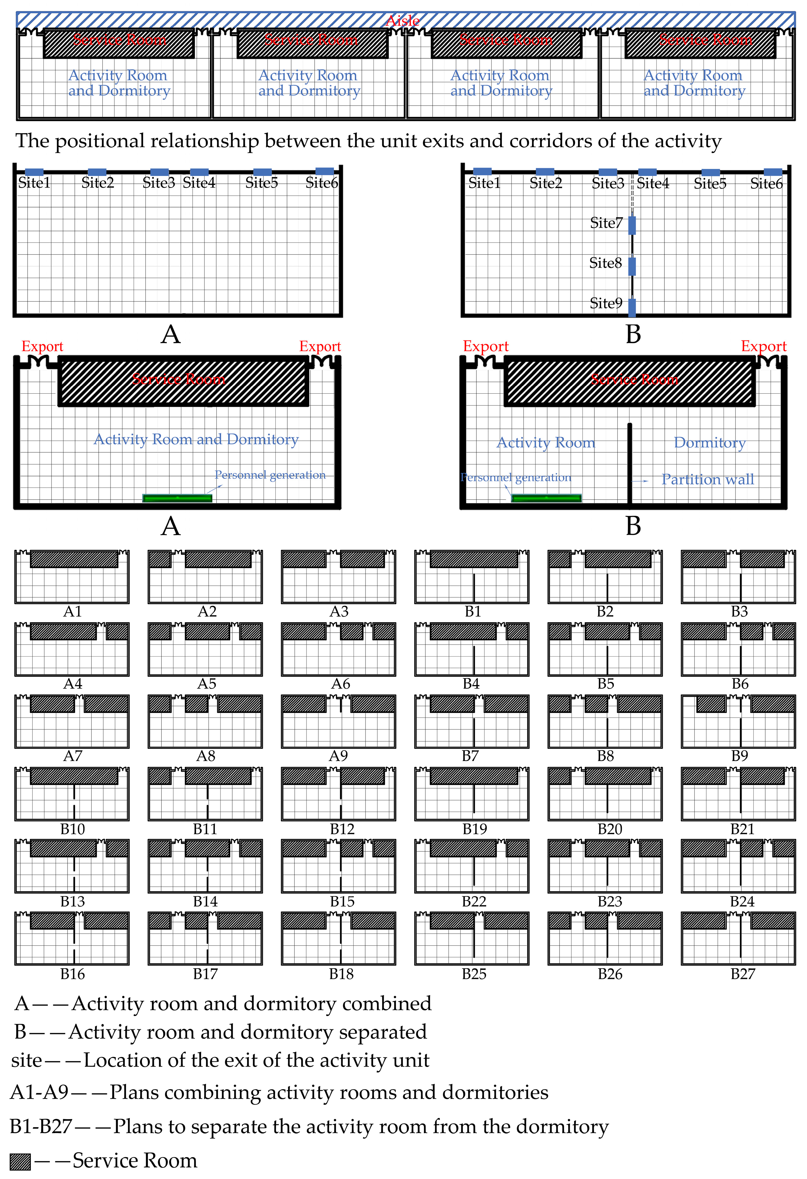 - In the form of combining the activity room and the dormitory, placing the exit of the activity room at the far end and the exit of the dormitory at the near end can effectively guide and divert traffic, thereby significantly improving the overall evacuation efficiency under this mode and reducing corridor congestion caused by the concentration of exits.