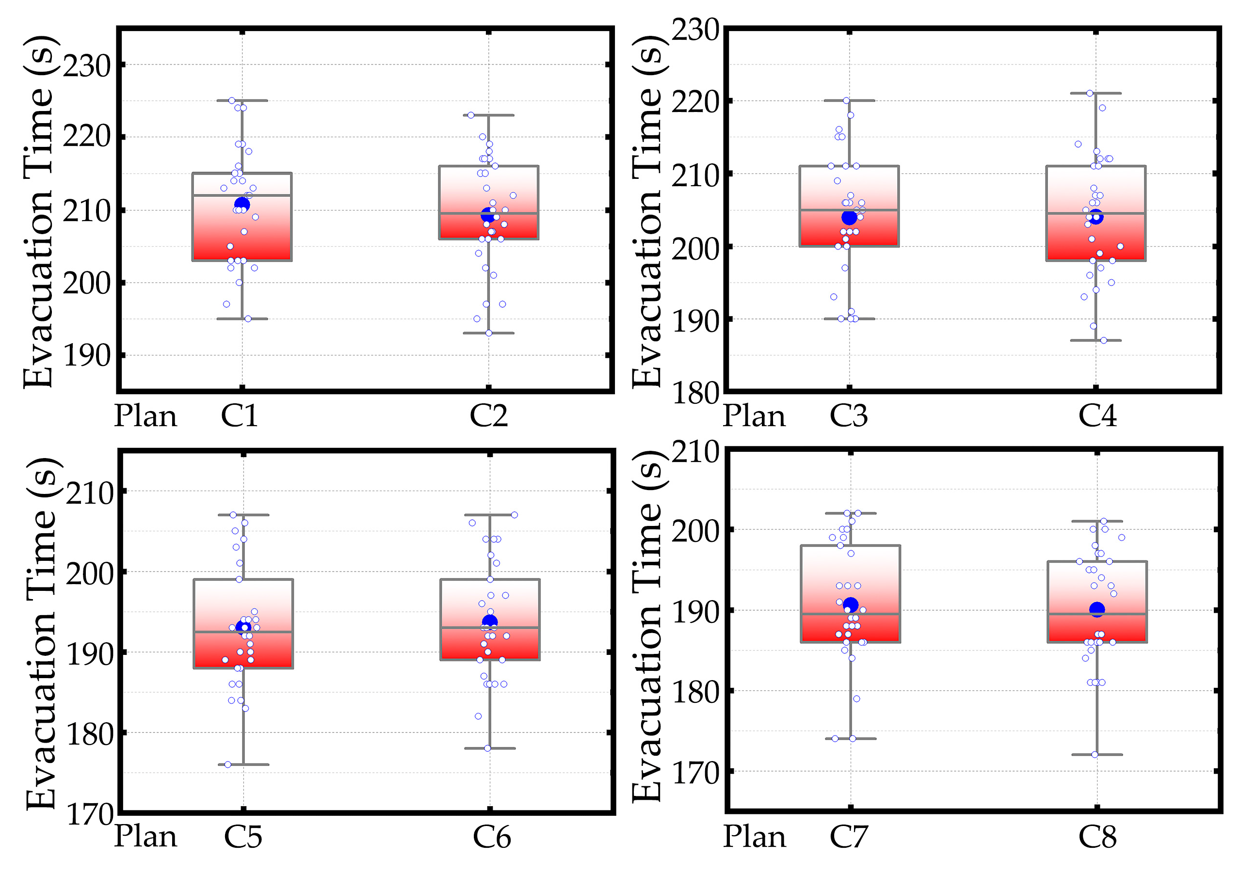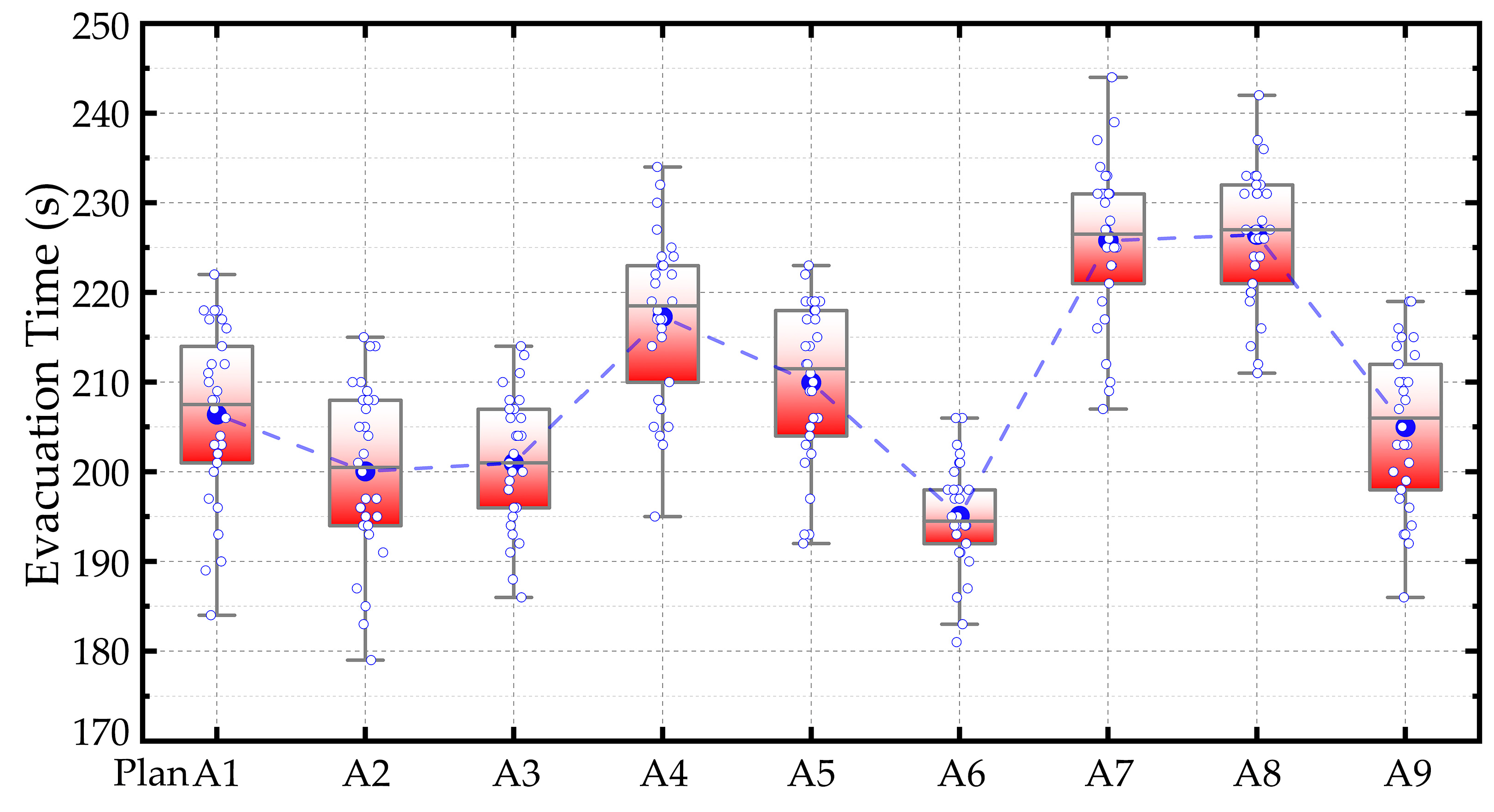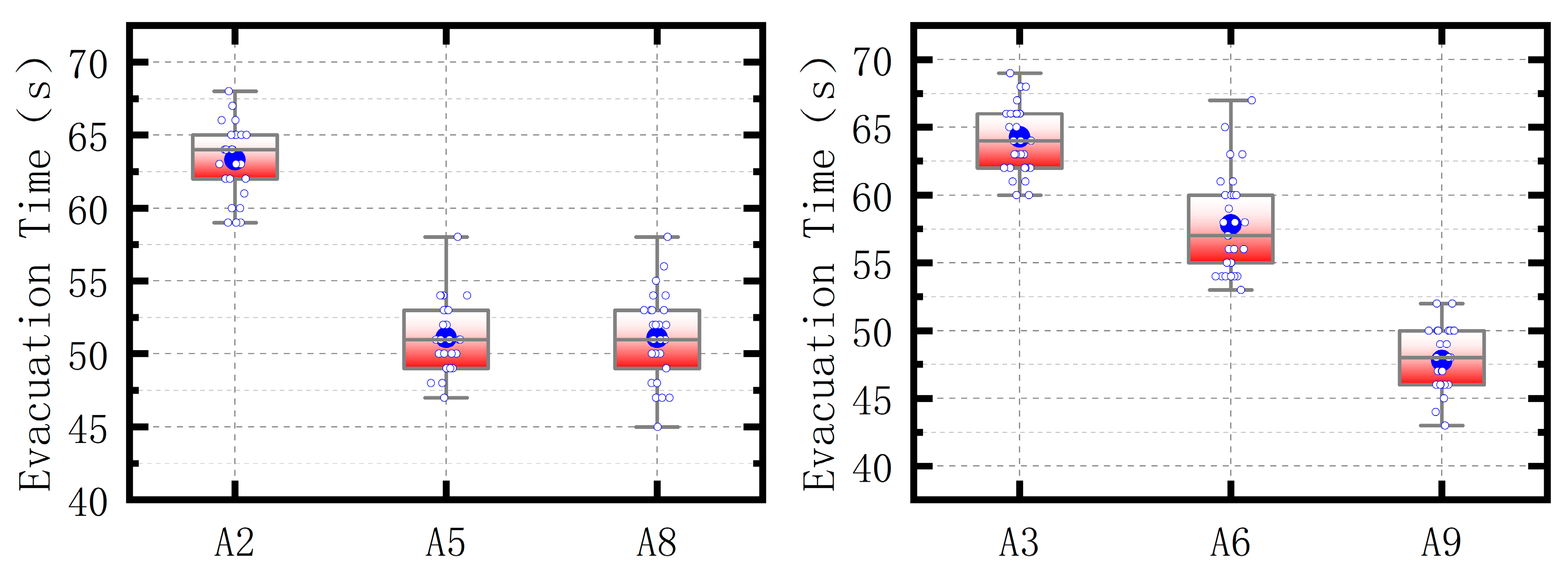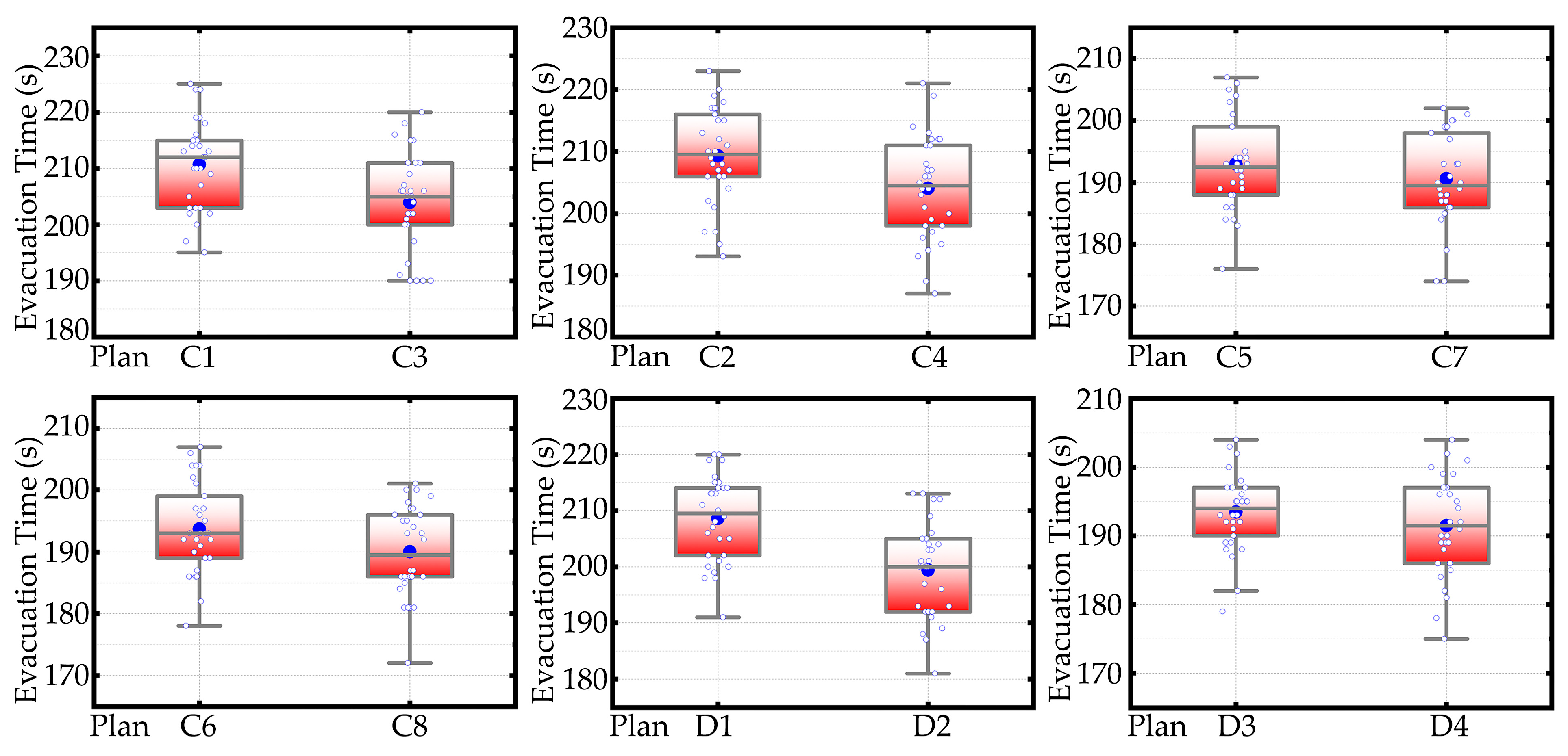 4.1.2. Impact of Separate Exits for Activity Rooms and Dormitories on Evacuation