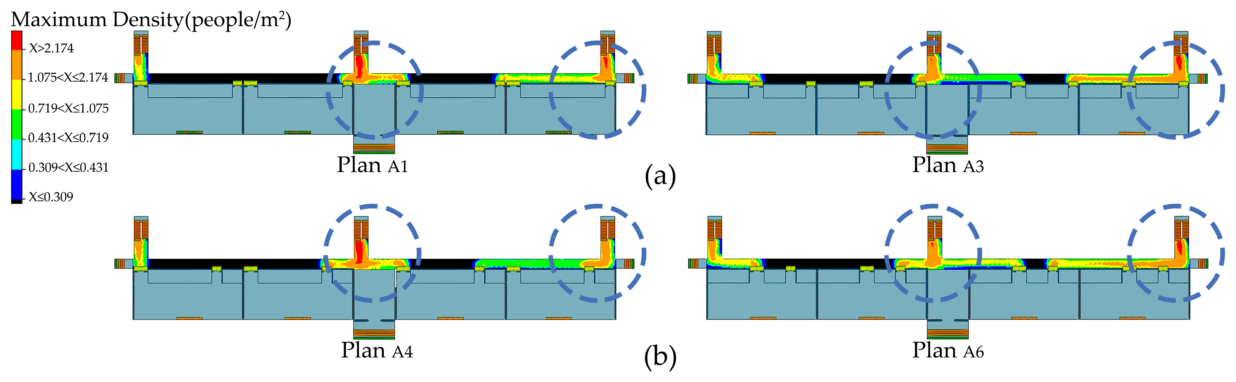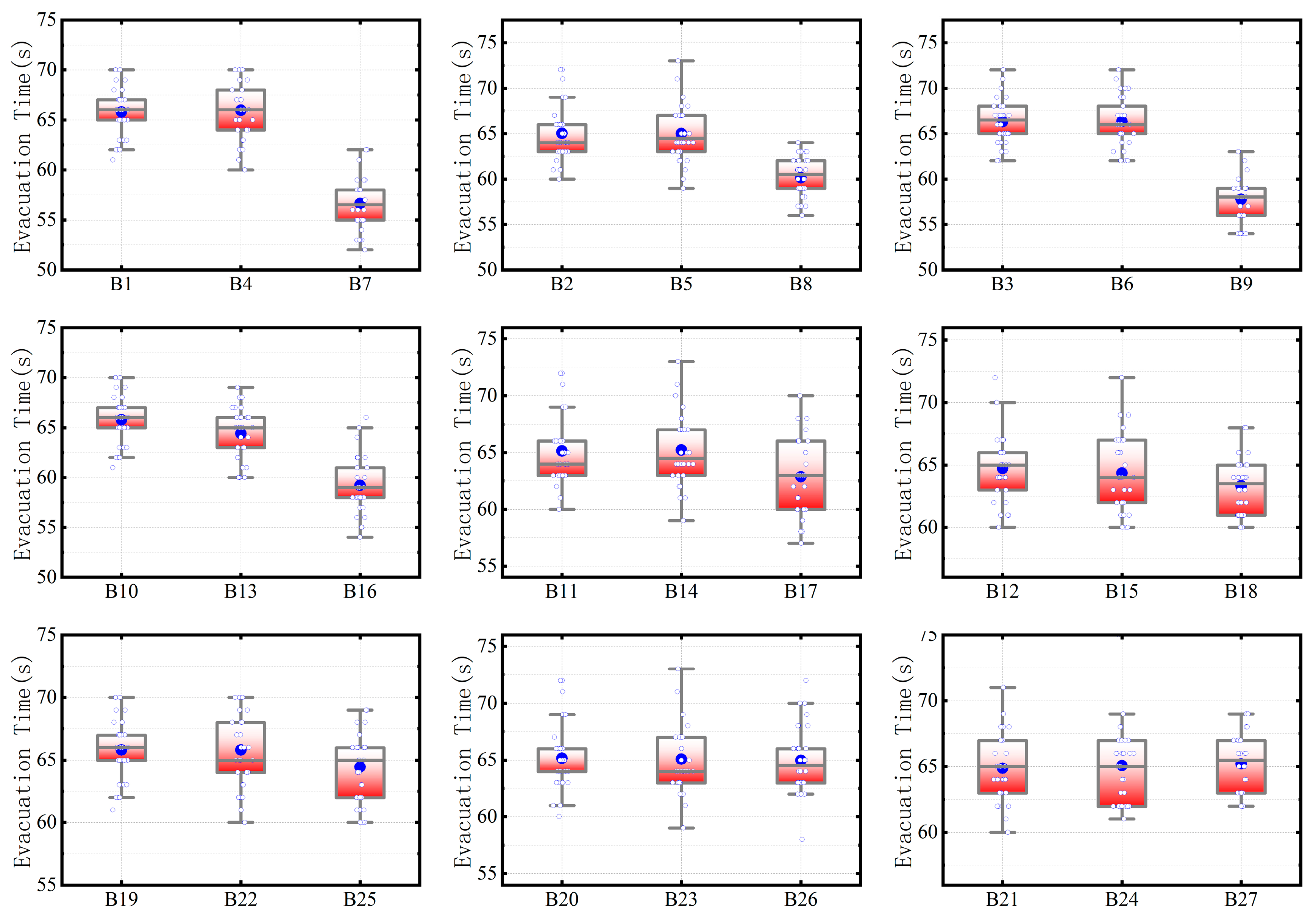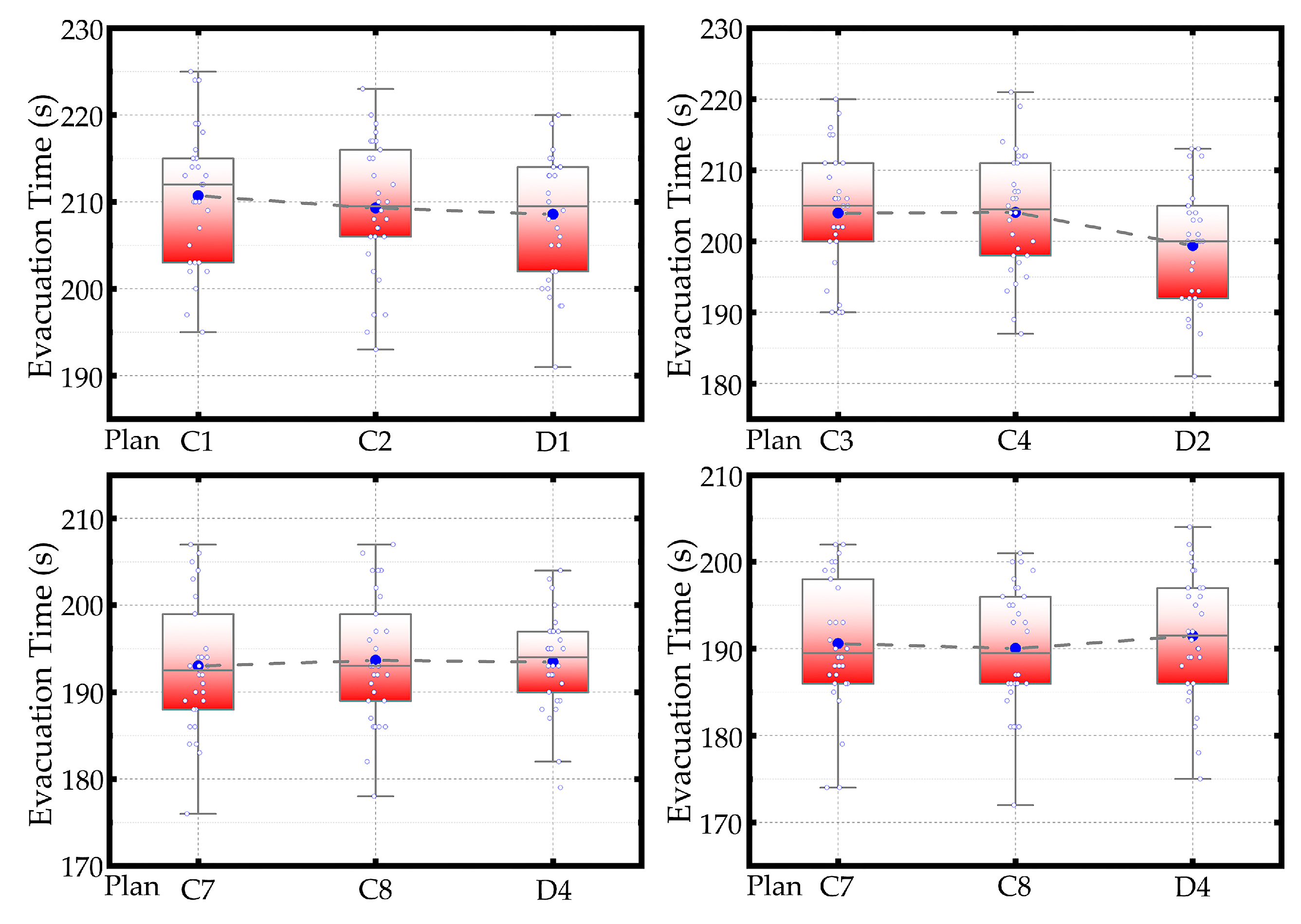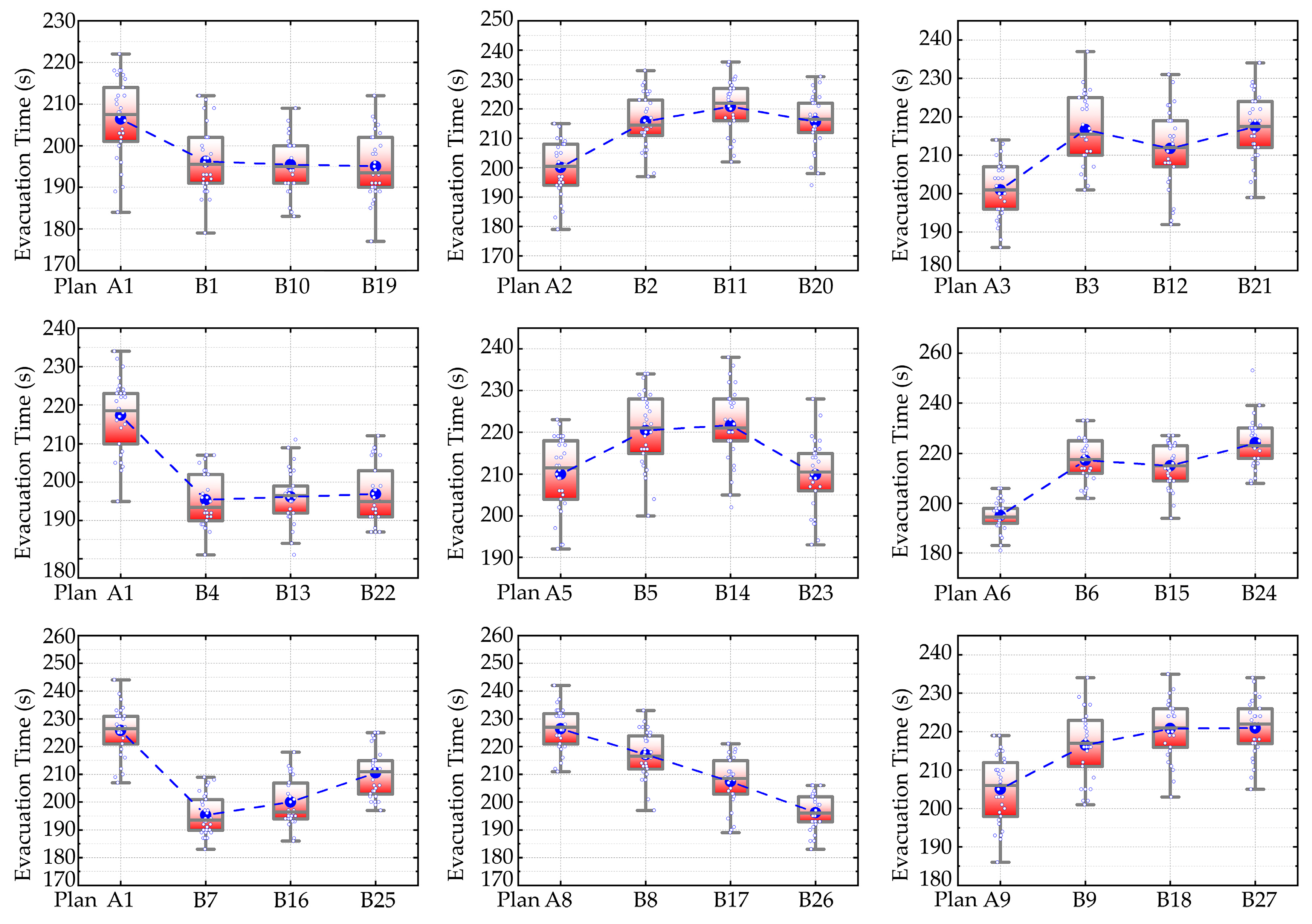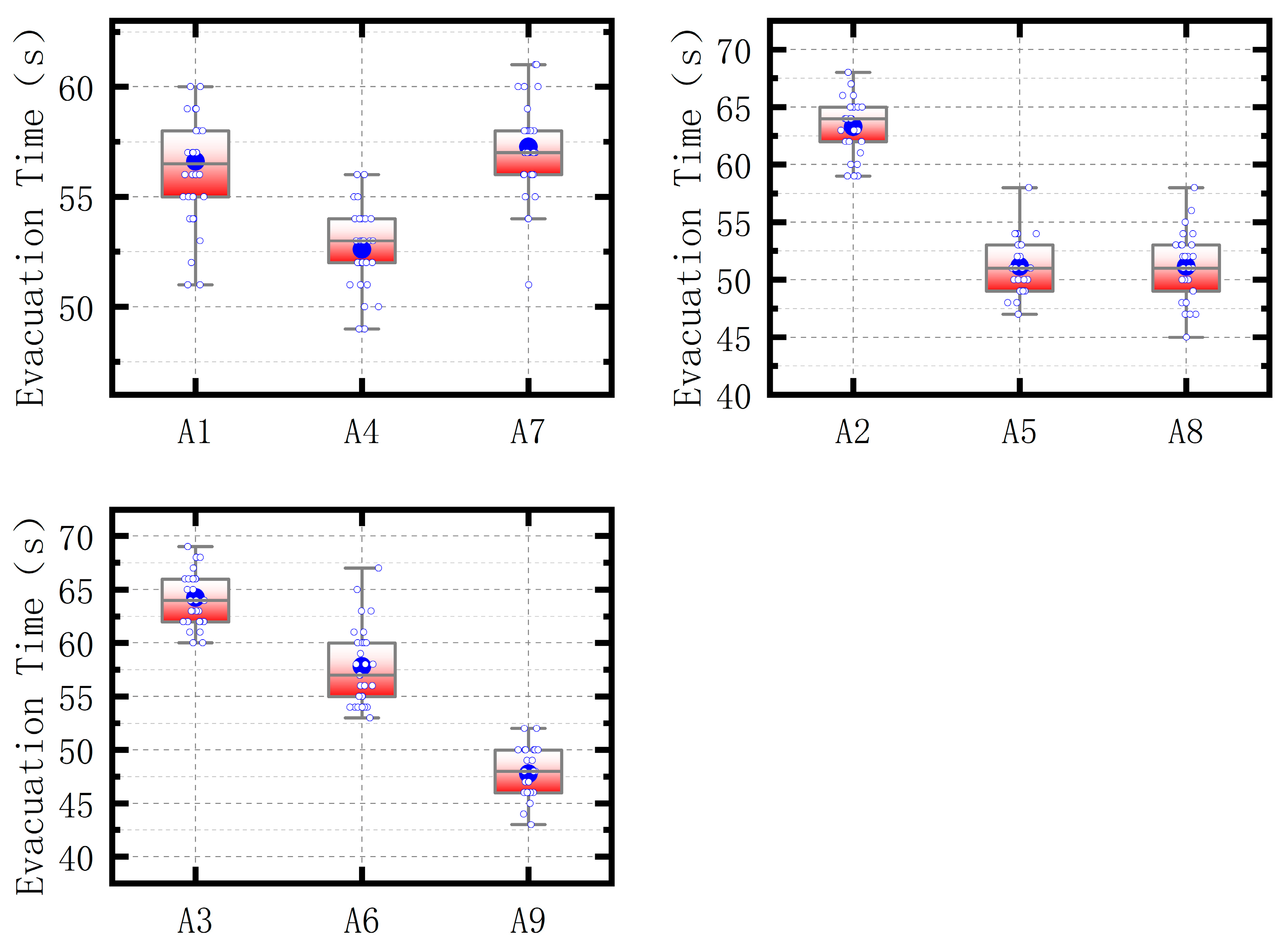 4.1.2. Impact of Separate Exits for Activity Rooms and Dormitories on Evacuation