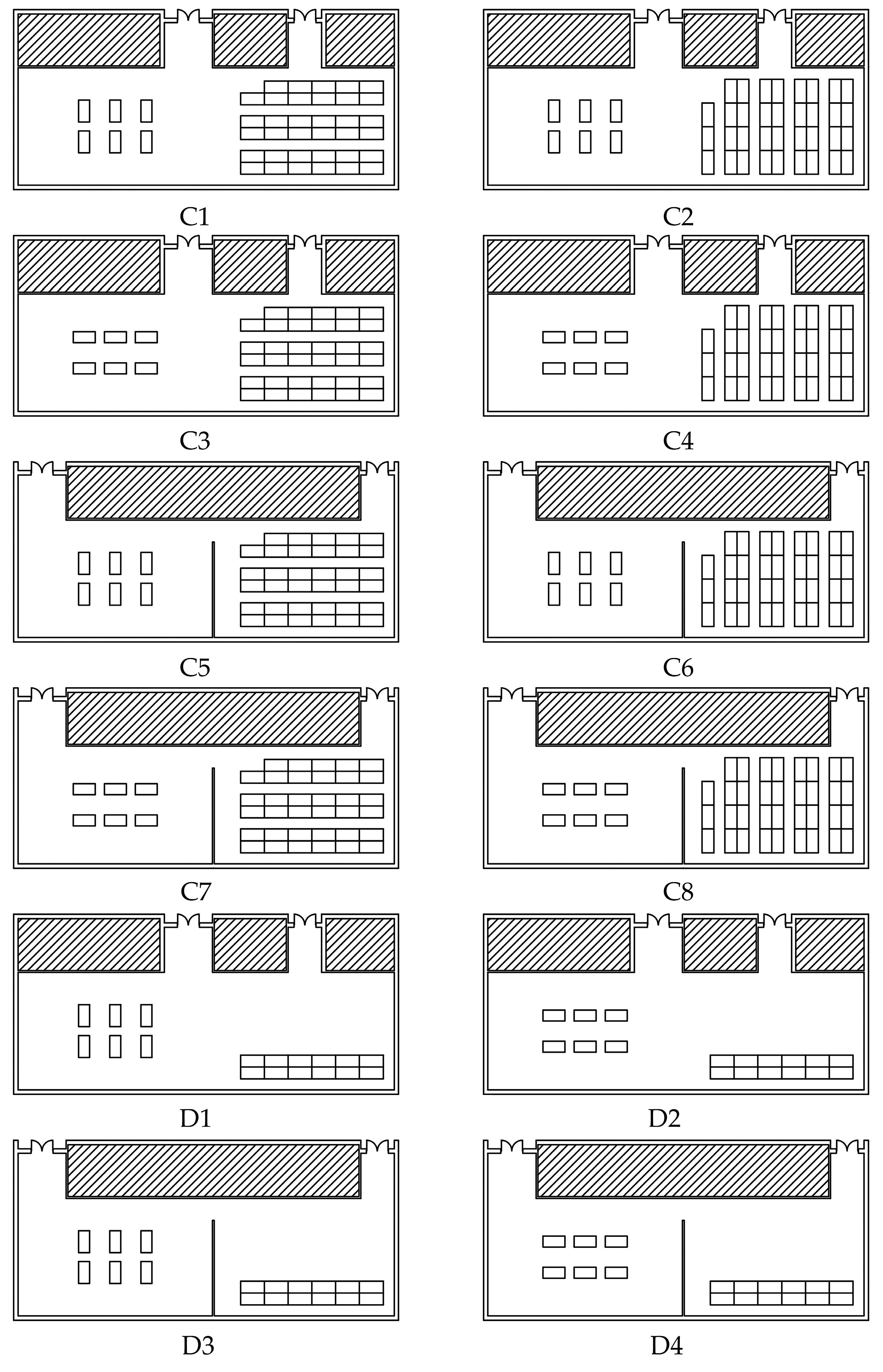 | Layout of activity unit furniture and dormitory beds | Horizontal arrangement of tables and chairs | ![]() | Activity room furniture arrangement parallel to the exit wall |