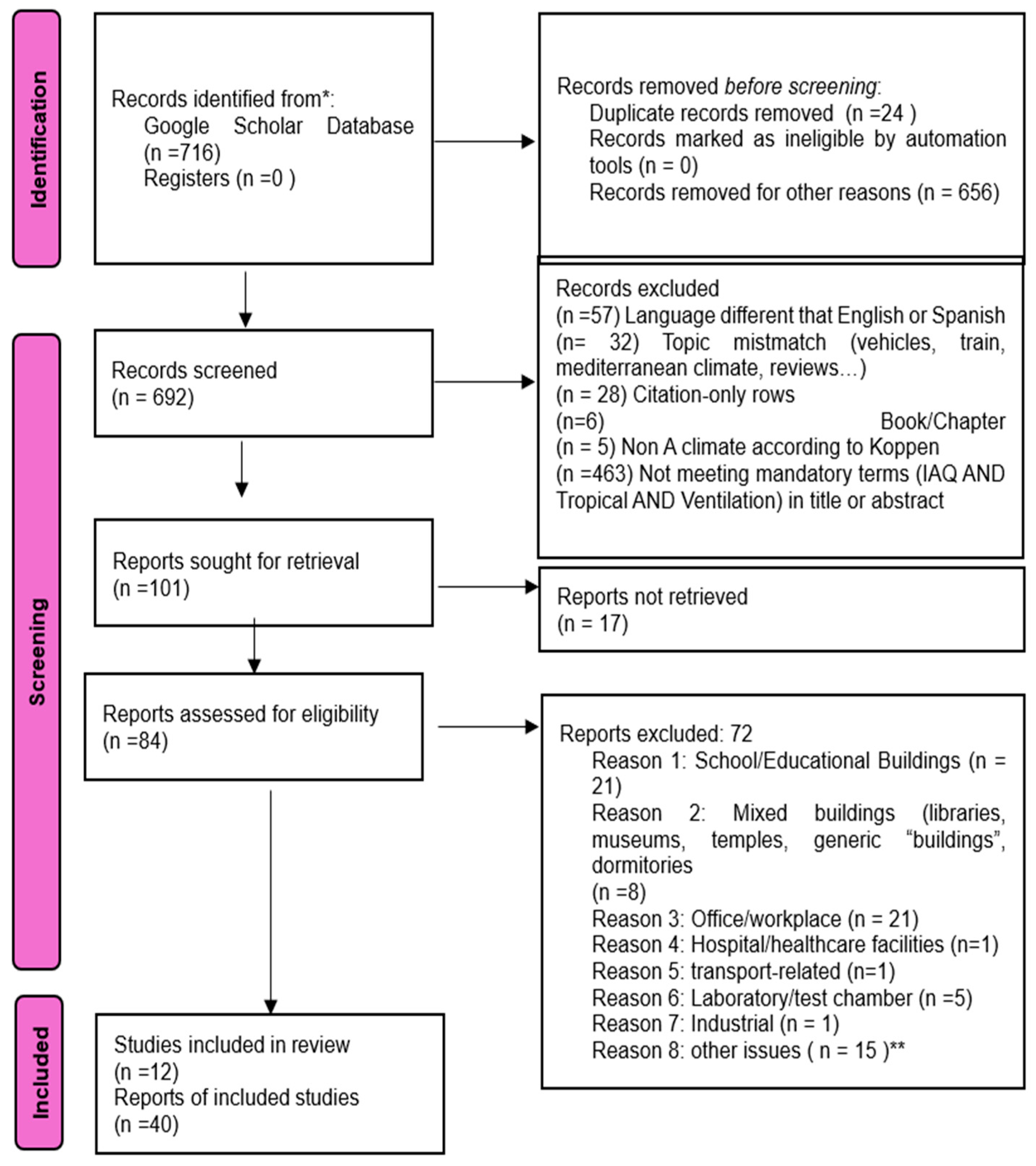| Excluded Nomenclature | Transport OR vehicle OR car OR bus OR metro OR public transport OR aircraft OR in-cabin OR mediterranean climate OR mediterranean OR desert OR subtropical |