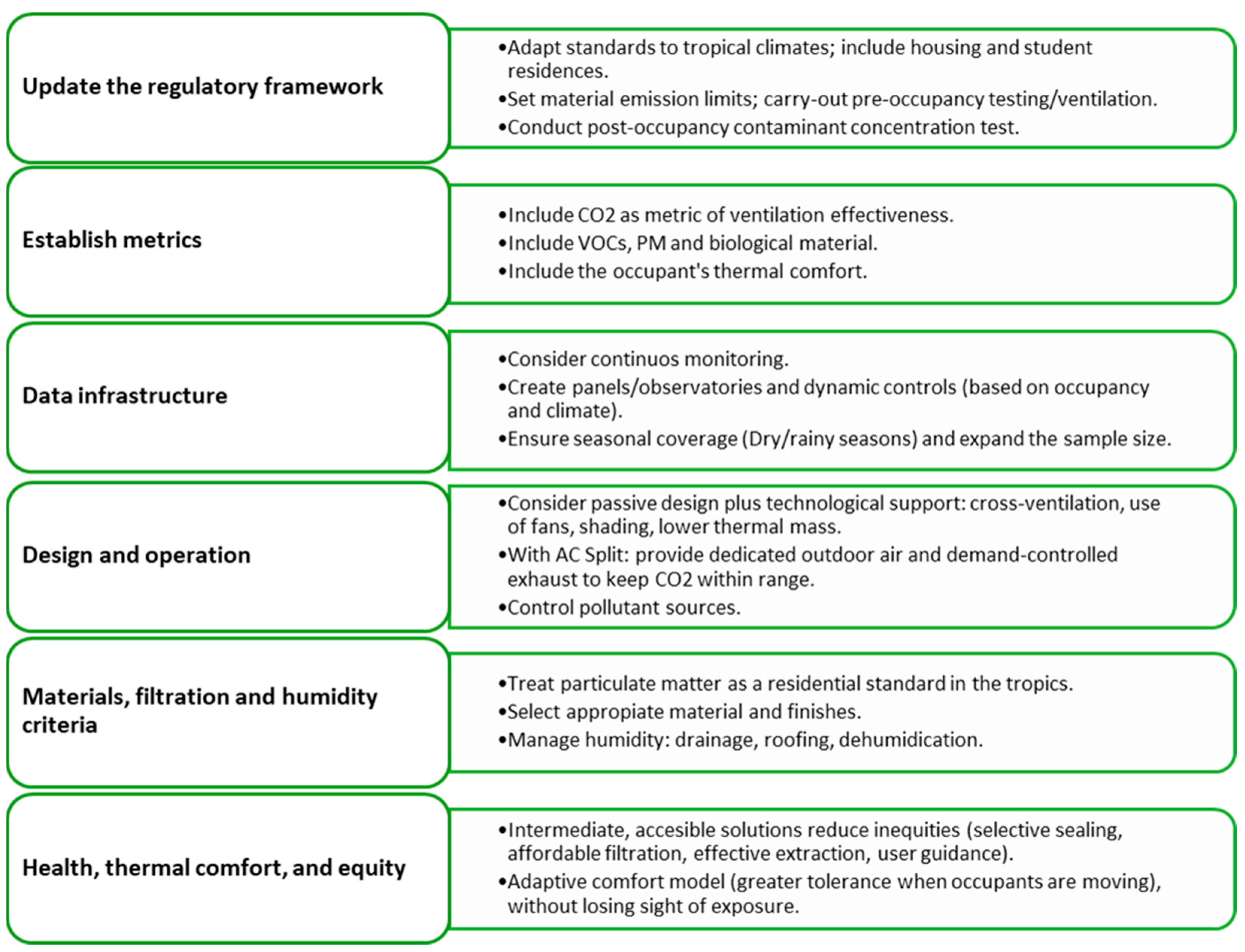 - Defining “acceptable/not acceptable” conditions require guidelines adapted to the tropics, as many countries lack binding residential limits, forcing the extrapolation of ambient or occupational air thresholds are extrapolated.