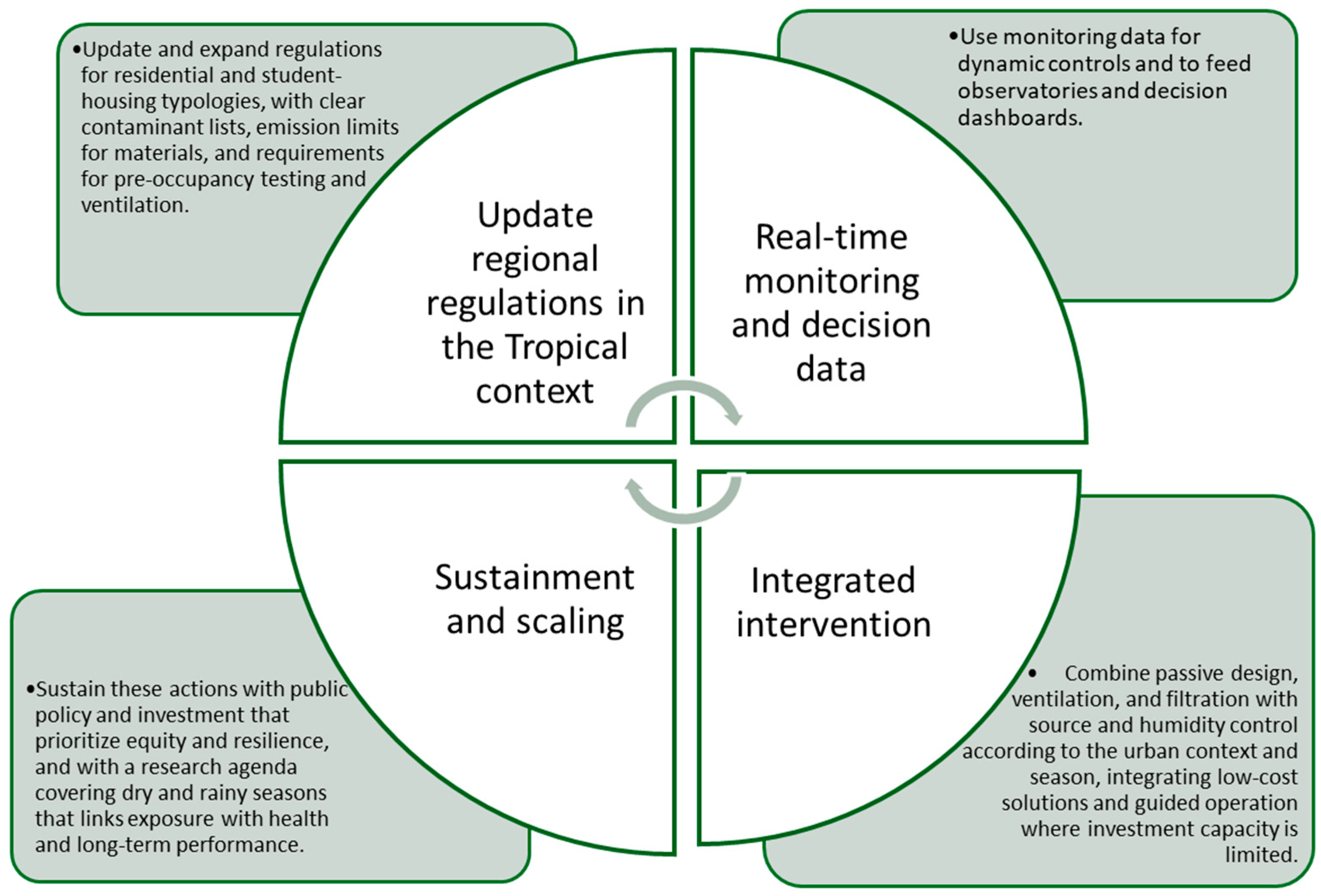 - Regulatory update: The most decisive opportunity is to close the regulatory gap. Since many warm-humid countries lack specific residential regulations, existing frameworks must be updated to criteria adapted to the tropical climate, expanding coverage to typologies like social housing and student residences. Research indicates that standards should explicitly include university dormitories, promoting pre-occupancy ventilation and mandatory testing, alongside stricter emission limits for building materials to protect student well-being [102]. Crucially, guidelines should require explicit reporting of window screens (type, density, cleanliness)—as they affect ventilation flow and PM penetration—and incorporate specifications for portable purifiers (e.g., CADR labeling).