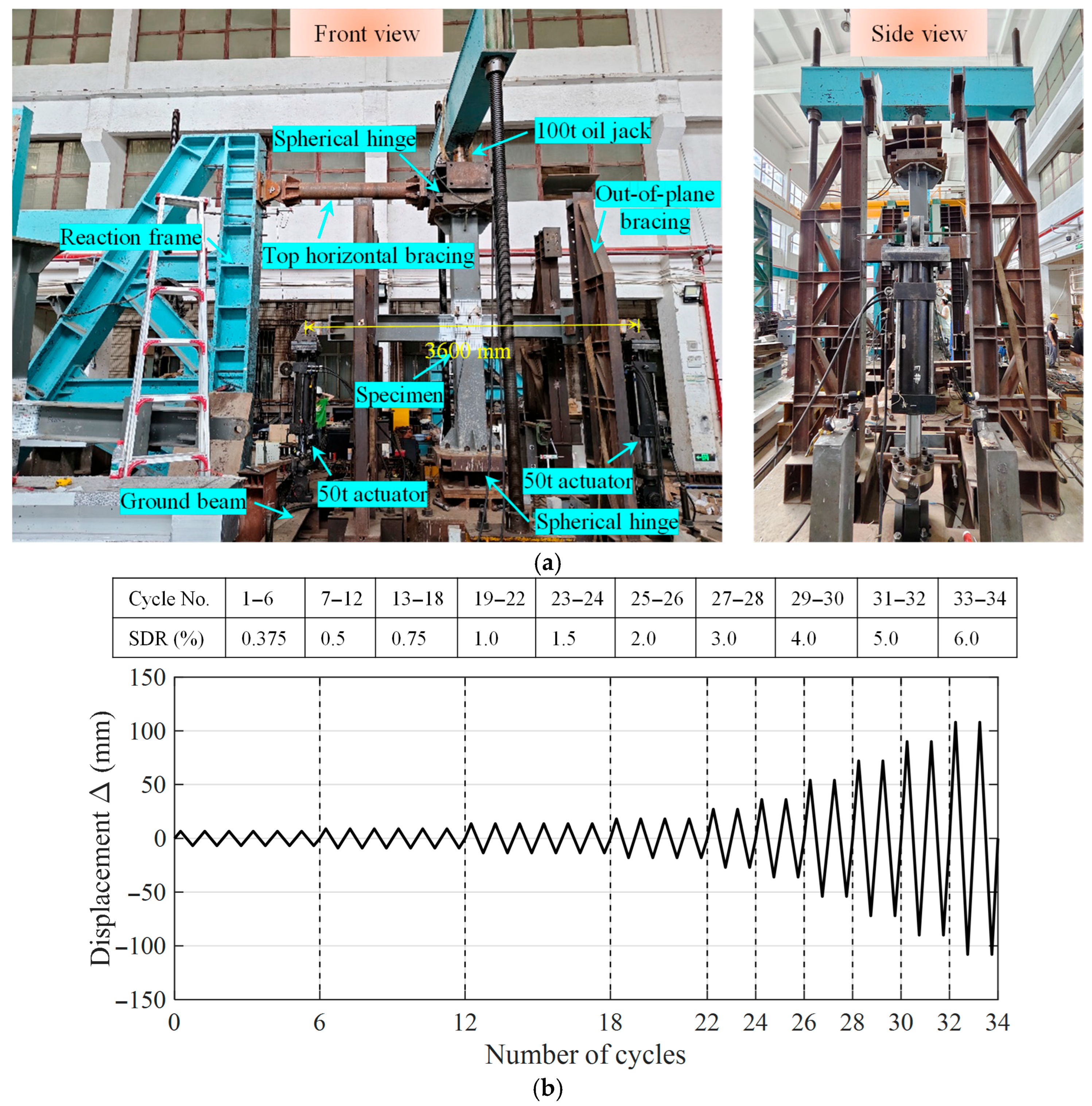 Based on the above considerations, this study systematically investigates the seismic behavior of irregular steel-beam–CFST column joints with IIDs and ηbc > 1.0. Two full-scale joint specimens, representing an UDB joint and an SB joint, were designed and tested under cycle loading. The failure modes, hysteresis curves, load-bearing capacities, stiffness degradation, strength degradation, energy dissipation performance, strain distributions, and panel zone shear behaviors of the specimens were discussed. Based on the experimental results, refined FE models for the irregular joints were developed and validated by the test data with good accuracy.