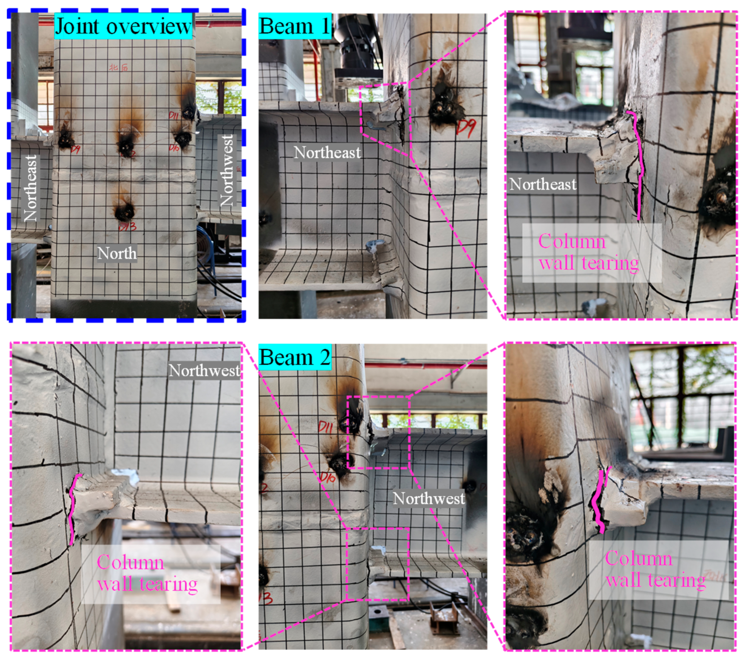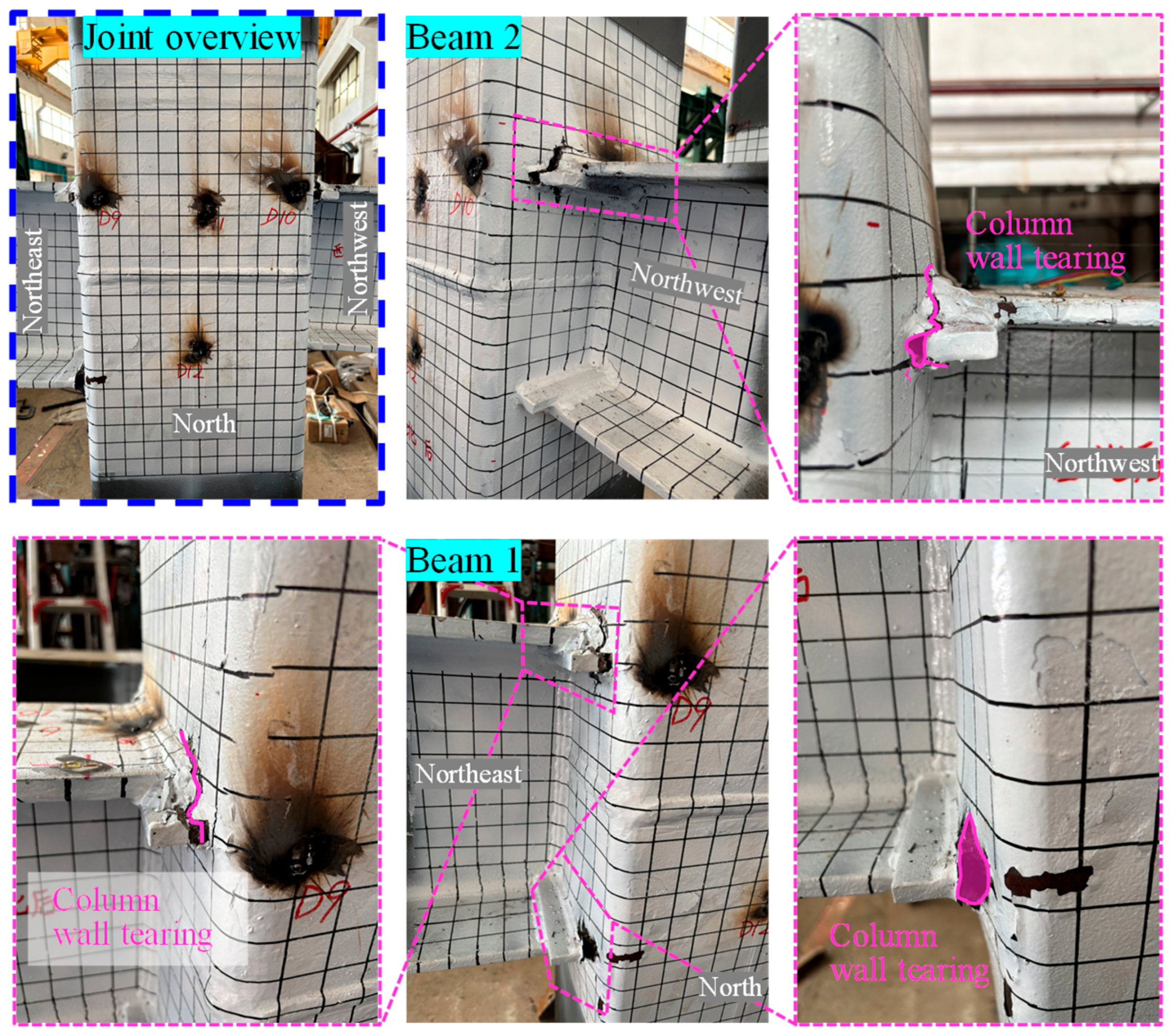 When the drift ratio increased to 5%, another sharp cracking sound was heard during loading. The weld between the bottom flange of Beam 2 and the column wall suddenly ruptured, and the column face was pulled open, indicating fracture of the lower ID weld. Shortly afterward, another loud sound was recorded as the weld between the top flange of Beam 2 and the column wall was torn and separated, again corresponding to ID weld fracture. Meanwhile, cracks at the interface between Beam 1 and the column wall further expanded. At a 6% drift ratio, both sides of the column wall exhibited severe tearing and significant bulging deformation. Ultimately, tearing of the column wall occurred at the top and bottom flange regions of Beam 1 and at the top flange region of Beam 2, forming a through-type tearing failure pattern.