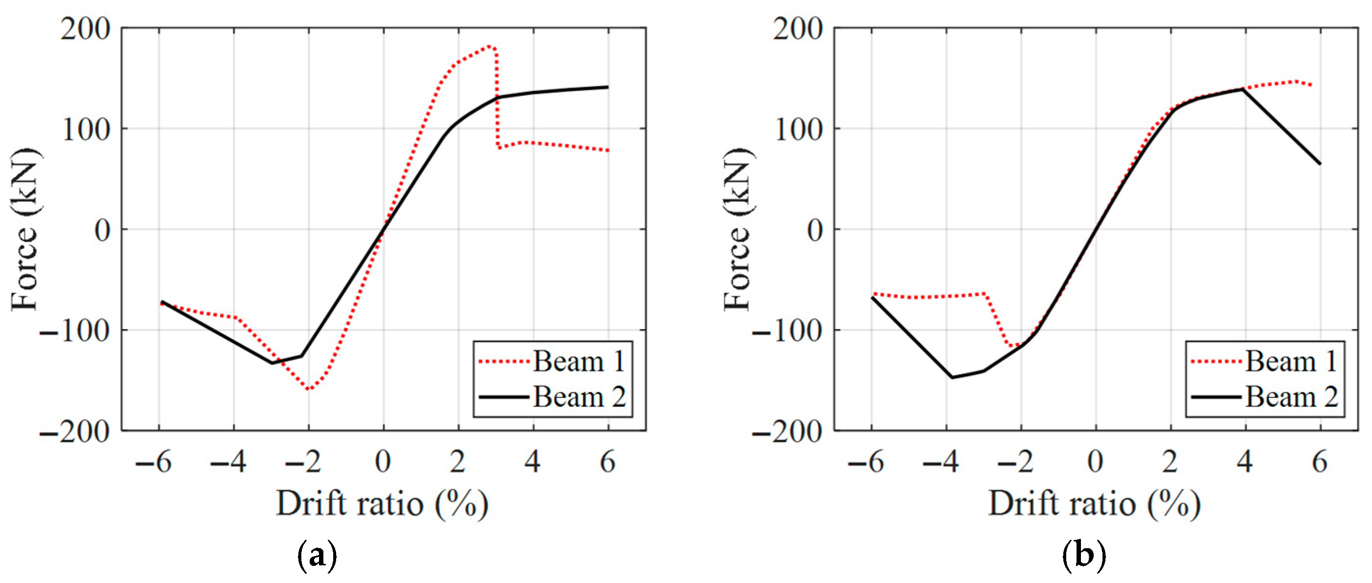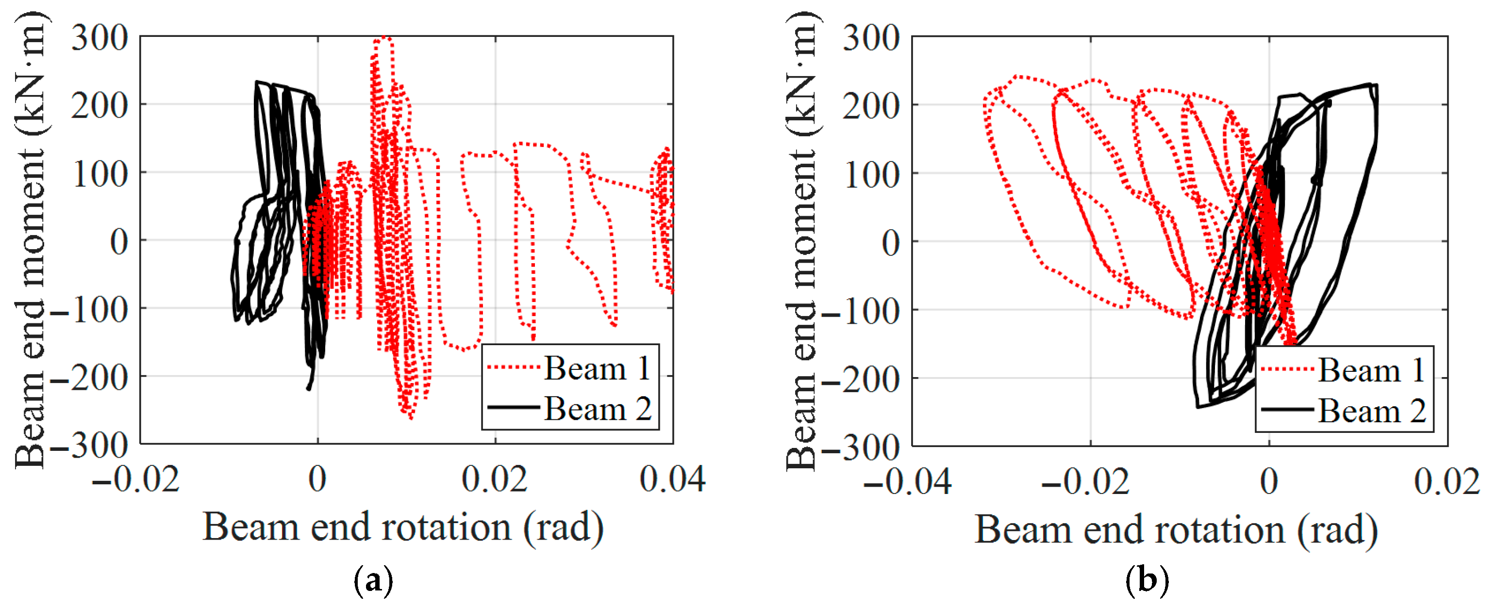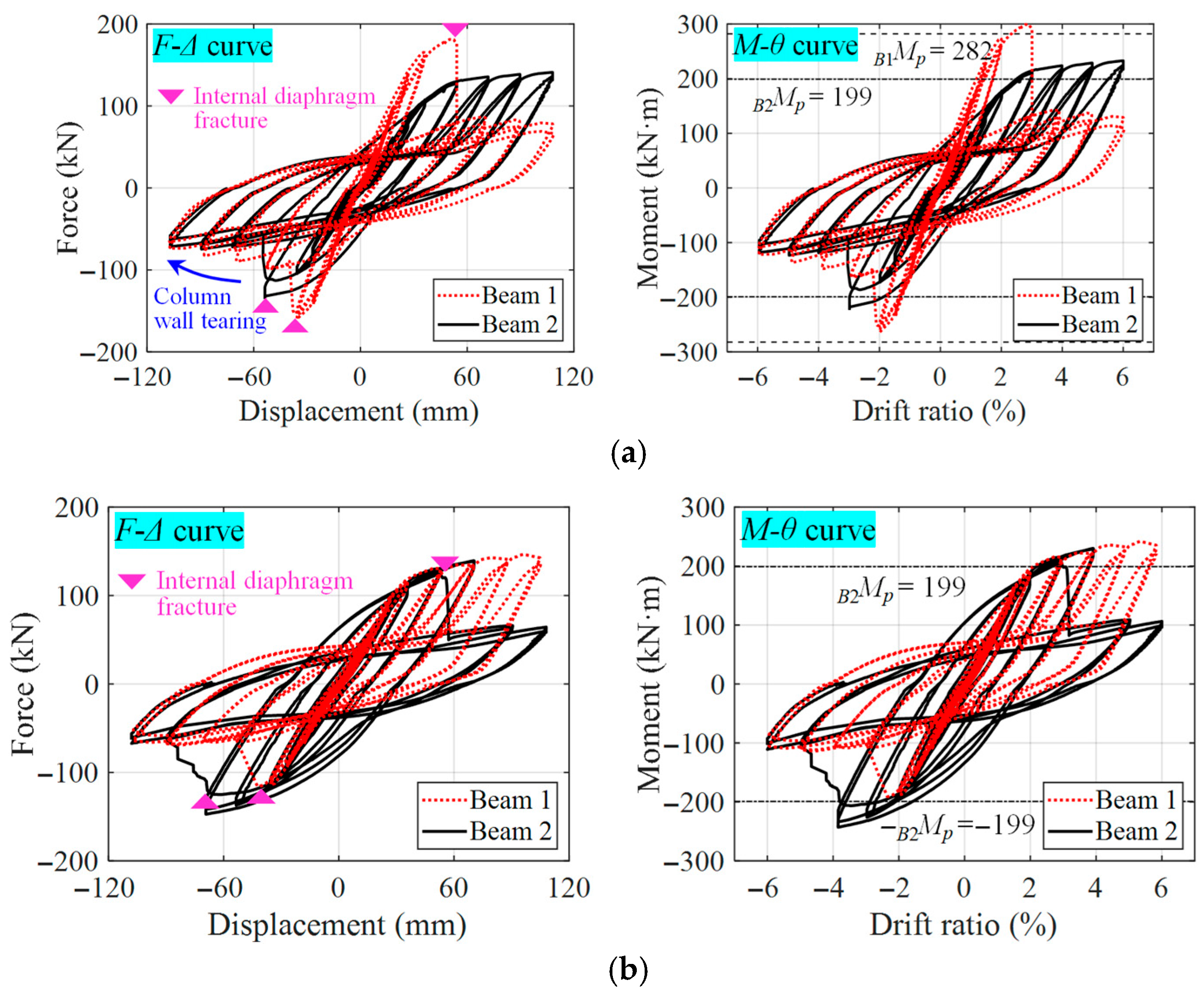 Figure 10 presents the hysteretic responses of Beam 1 and Beam 2 for both specimens. The loading direction was defined as positive when the beam top flange was in compression and the bottom flange was in tension. The