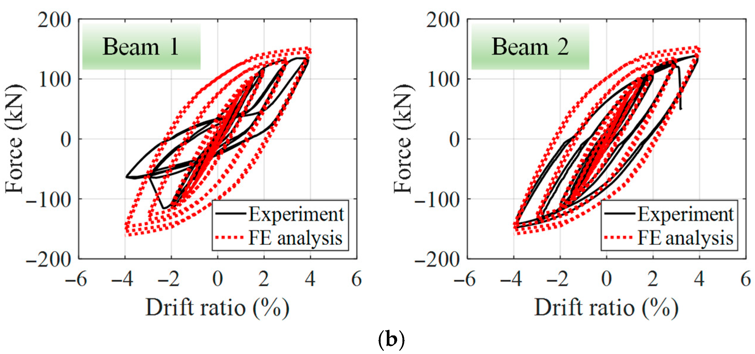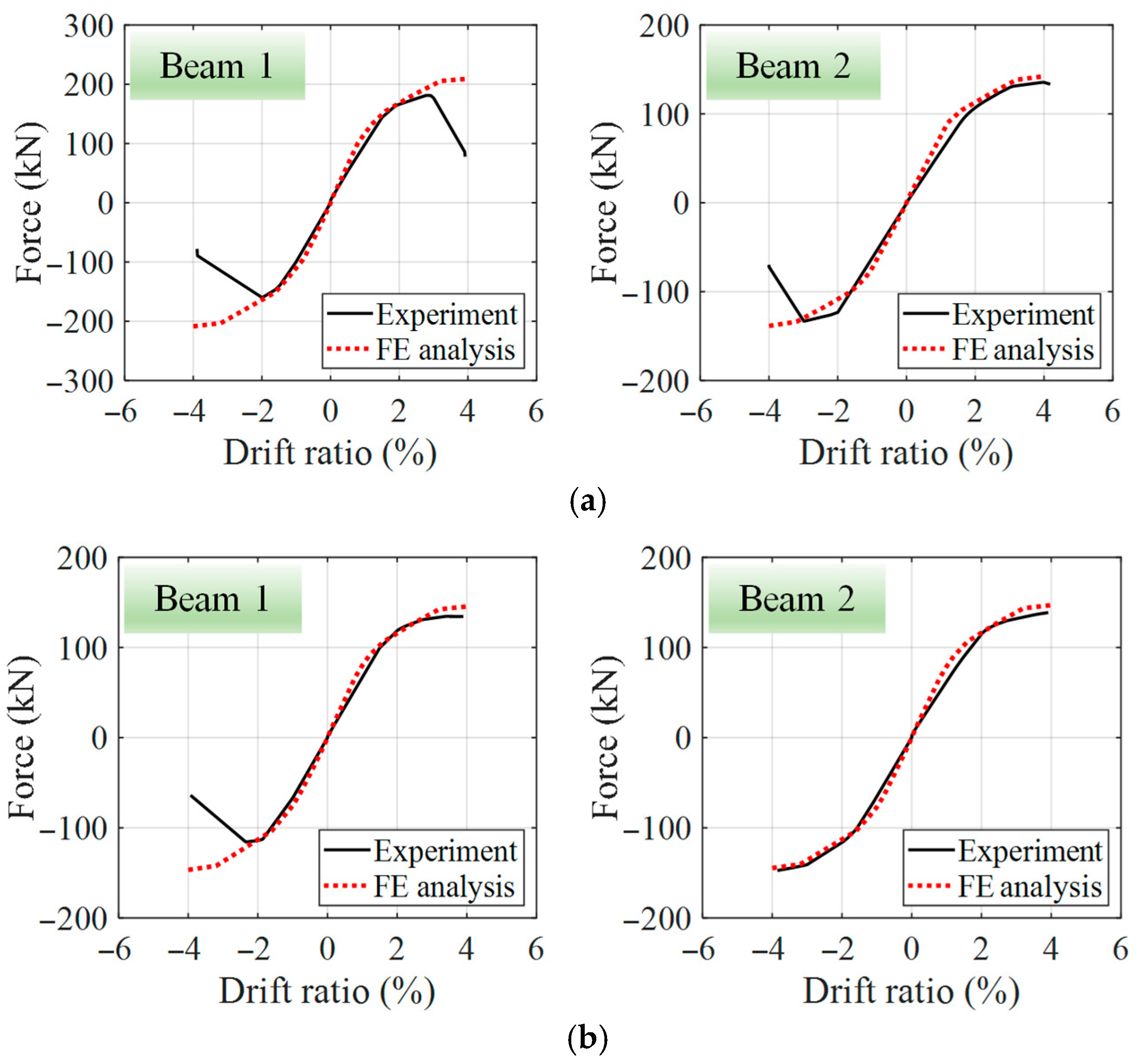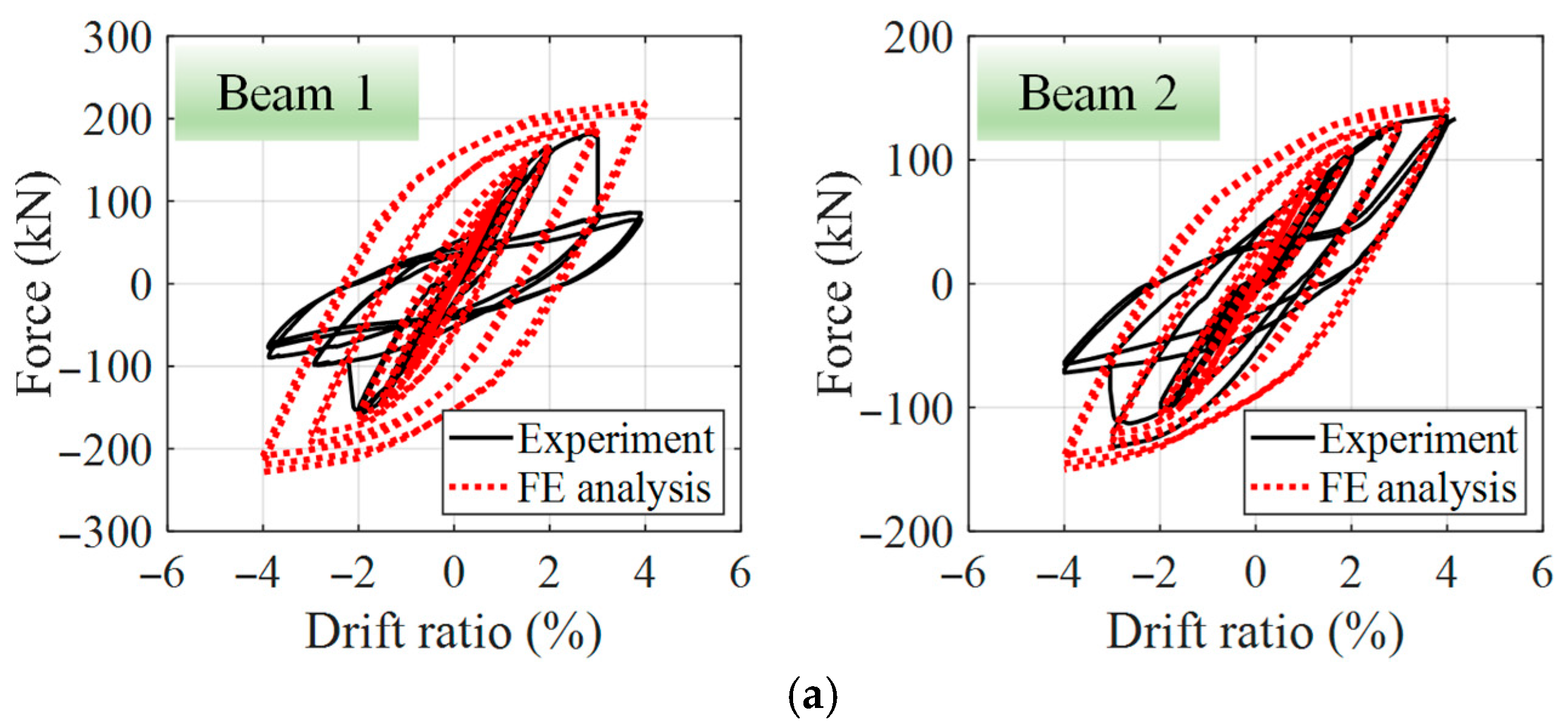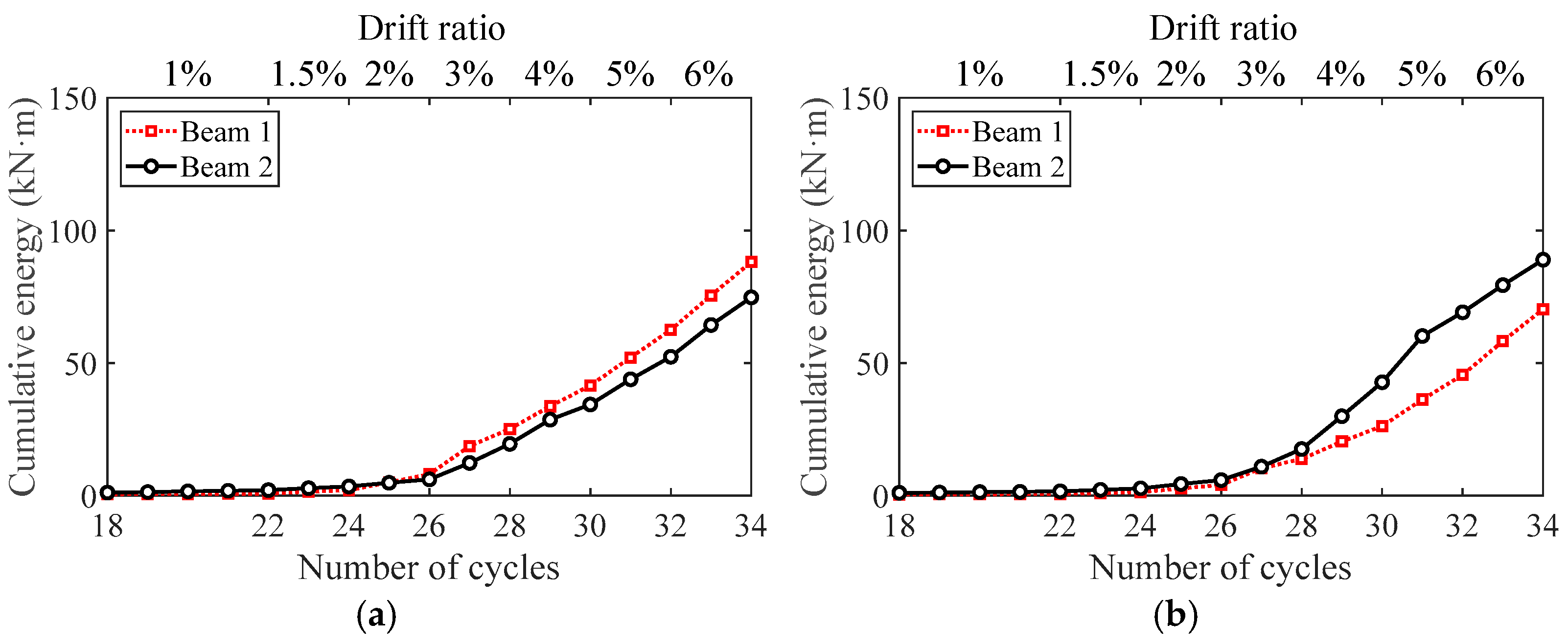 Figure 10 presents the hysteretic responses of Beam 1 and Beam 2 for both specimens. The loading direction was defined as positive when the beam top flange was in compression and the bottom flange was in tension. The