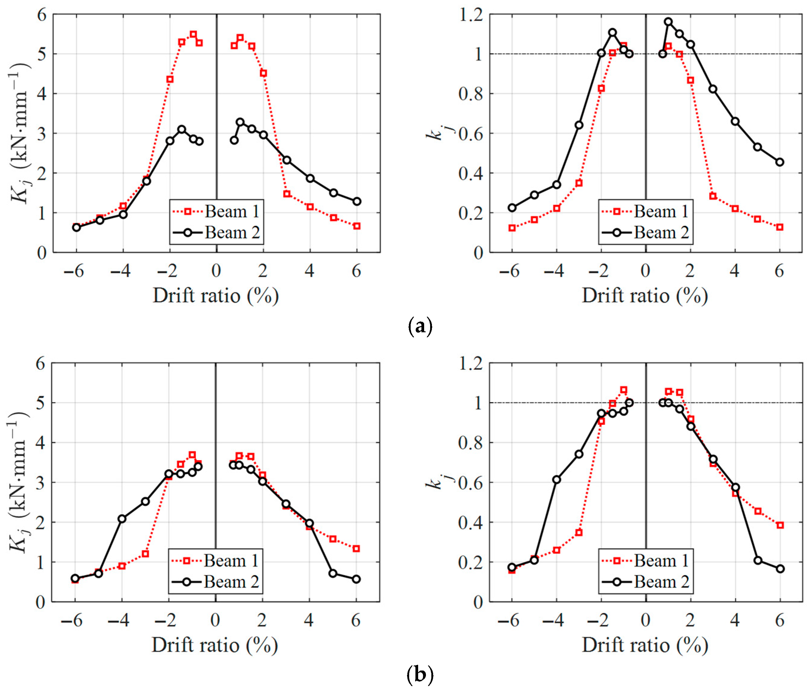 kj was expressed as the ratio of the current stiffness to the initial peak stiffness, serving to quantitatively evaluate the rate of degradation. Overall, both types of irregular joints exhibited a gradual reduction in stiffness with increasing drift ratio, showing a typical cyclic degradation pattern.