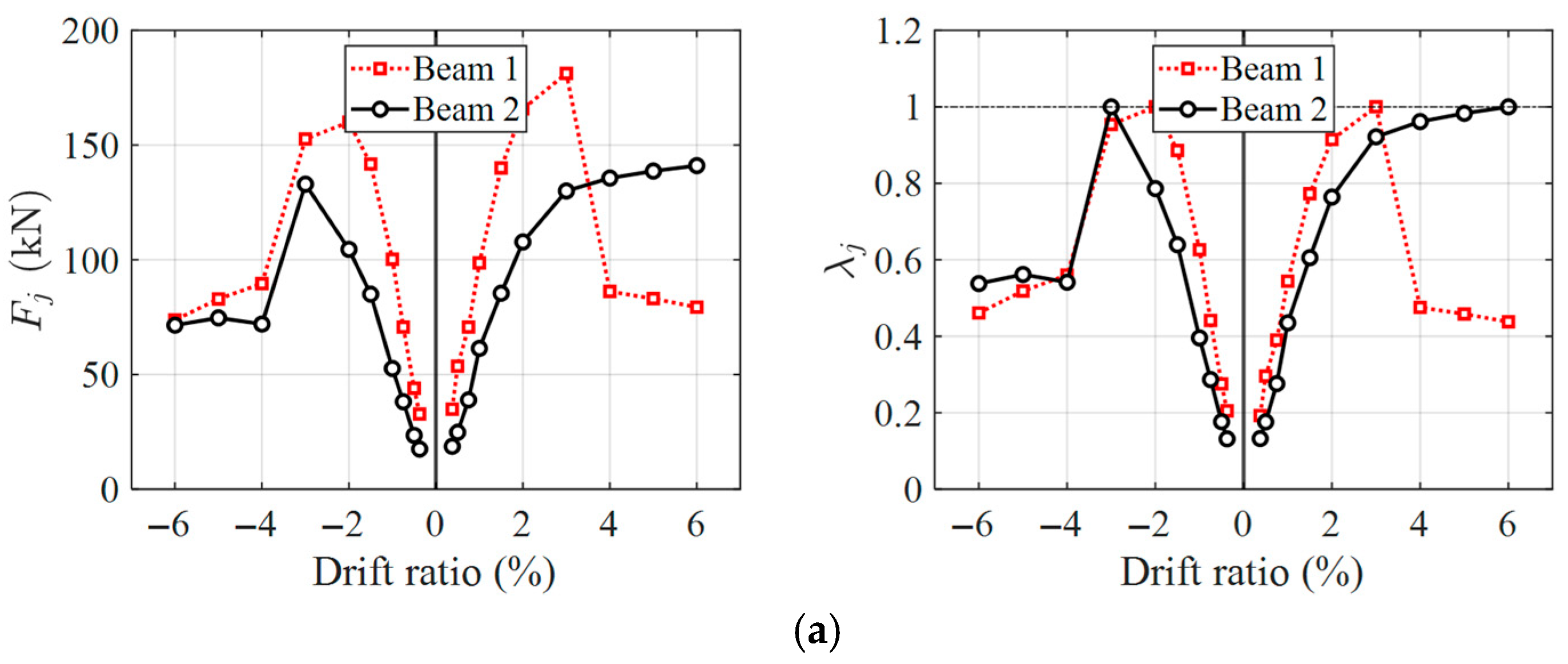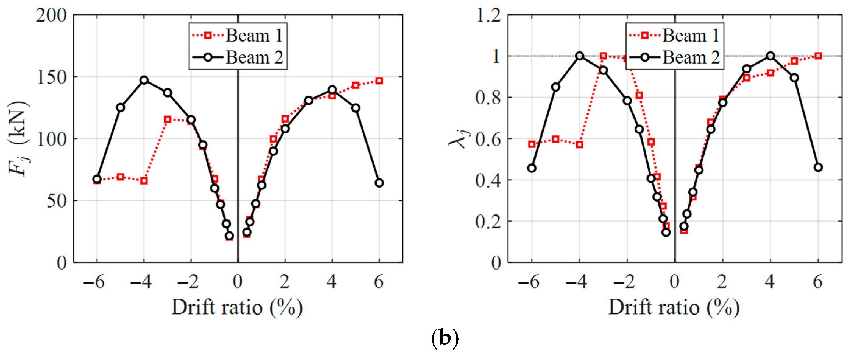λj corresponds to the average of all repeated cycles at that drift level, in order to reflect the overall degradation trend. Overall, both types of irregular joints exhibited a characteristic three-stage trend of “growth-drop-stabilization”, and the differences between the two beams were primarily governed by the joint geometry and the stress state of the ID.