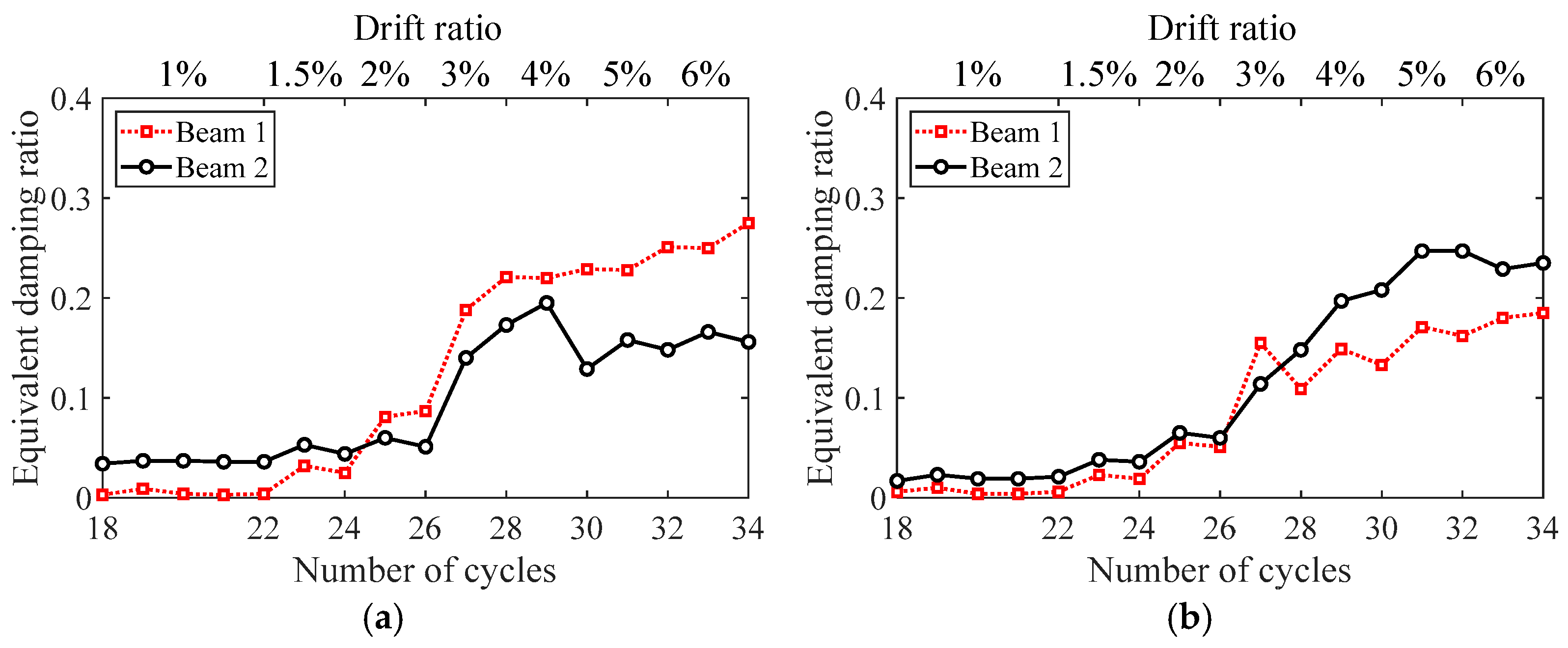 For specimen SSBJ-IID-1, both beams exhibited a more balanced energy dissipation trend. Before a 2% drift ratio, the cumulative energy was limited, but it increased rapidly thereafter. When the upper inclined diaphragm of Beam 1 fractured at a 3% drift, its energy dissipation capacity declined, while Beam 2 continued to accumulate energy and surpassed Beam 1. With further loading up to a 5% drift, both upper and lower diaphragms of Beam 2 fractured, resulting in a gradual reduction in the energy growth rate. The equivalent damping ratios of Beams 1 and 2 stabilized at approximately 0.23–0.25 and 0.16–0.19, respectively, at drift ratios of 3% and 5%. These values exceed the ASCE 41 acceptance limit of
