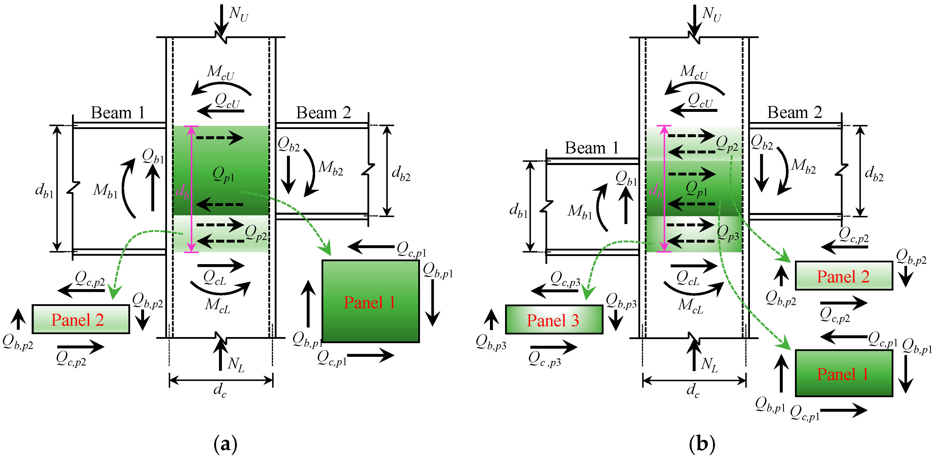 Figure 17. The panel zone is subdivided into multiple sub-regions according to the beam-column intersection geometry. When lateral loading is applied, the flexural moments transmitted from the beam ends induce unbalanced shear forces across these sub-regions. The whole panel zone can therefore be idealized as a system composed of several shear segments (three for the SSB joint and two for the UDSB joint), each subjected to distinct internal force distributions. The arrows in