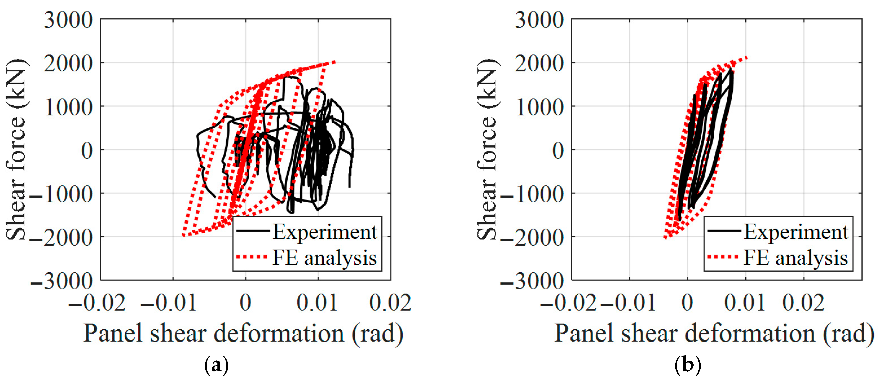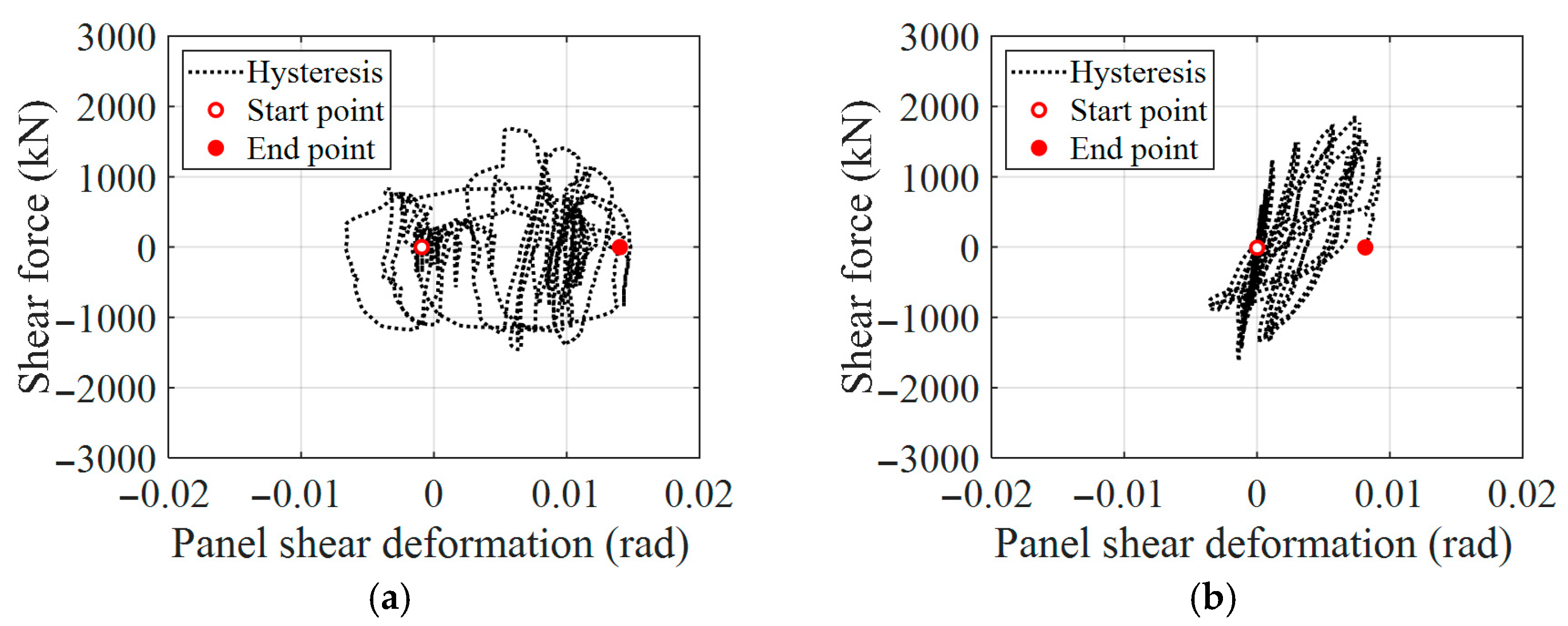 For UDSBJ-IID-1, the hysteretic loops appeared fuller, demonstrating pronounced energy dissipation and accumulation of residual deformation during cyclic loading. The maximum panel shear force reached approximately 1684 kN, corresponding to a maximum shear deformation angle of about 0.015 rad. Upon unloading, a residual shear deformation angle of about 0.014 rad remained, indicating a significant degree of irreversible deformation. The larger panel deformation in this specimen was primarily attributed to the earlier and more severe fracture of the upper and lower diaphragms of Beam 1, which altered the internal force transfer path, promoted unilateral shear plasticity, and resulted in the observed offset and fuller hysteretic loops.