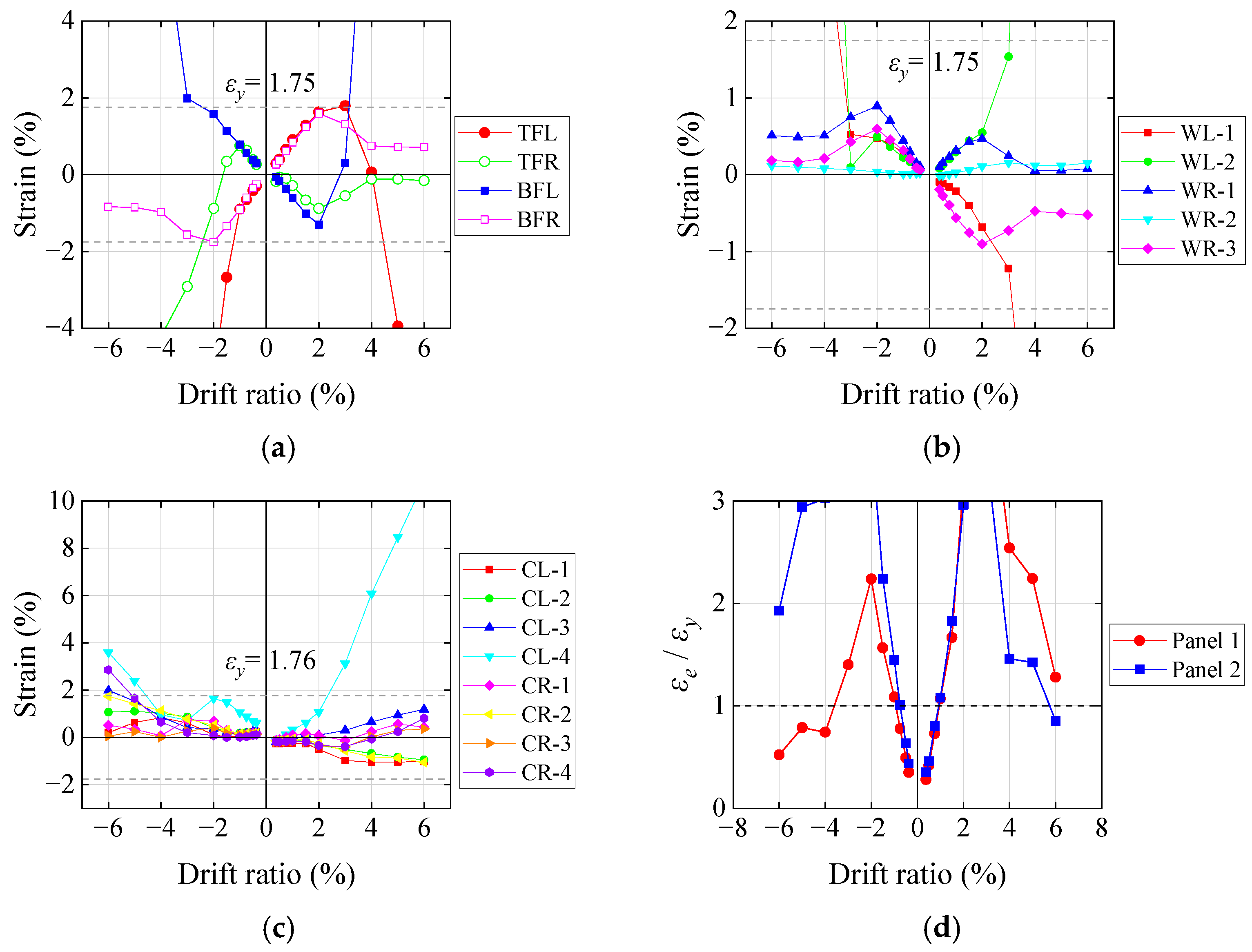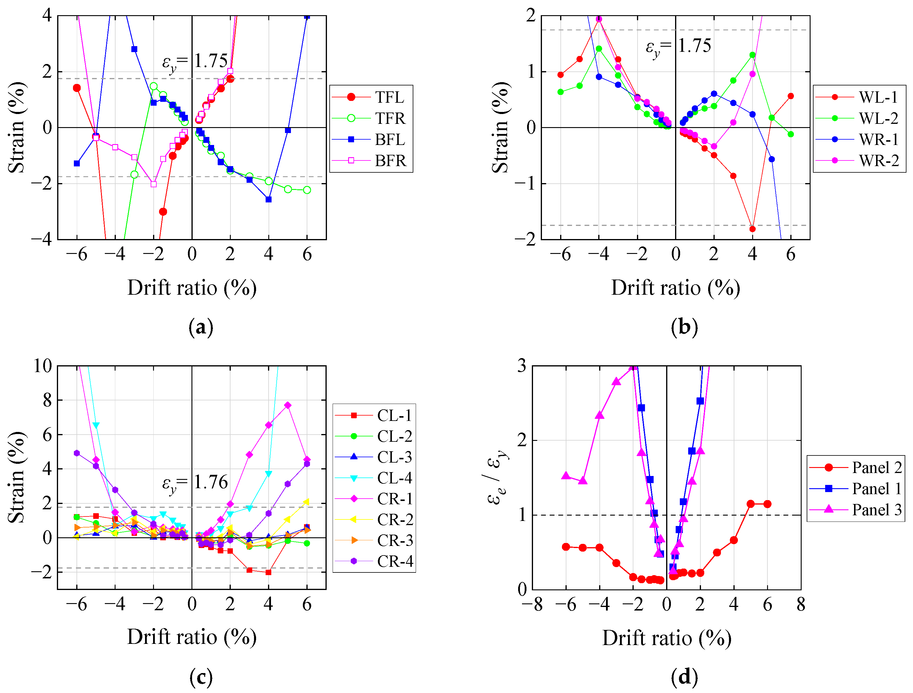 εy. This was followed by the bottom flange of Beam 1 (BFR), which entered the plastic stage beyond 2% drift. As the loading progressed, the strain directions of Beams 1 and 2 diverged, indicating asymmetric yielding caused by the accumulation of residual plastic deformation. The web strain remained relatively low, with only Beam 2 showing partial yielding after 3% drift, suggesting that flexural resistance was mainly provided by the flange zones. The column-wall strain was generally uniform along the height but began to increase noticeably after 3% drift, particularly at measurement point CL-4 near the Beam 2 bottom flange, where diaphragm weld fracture occurred. As shown in