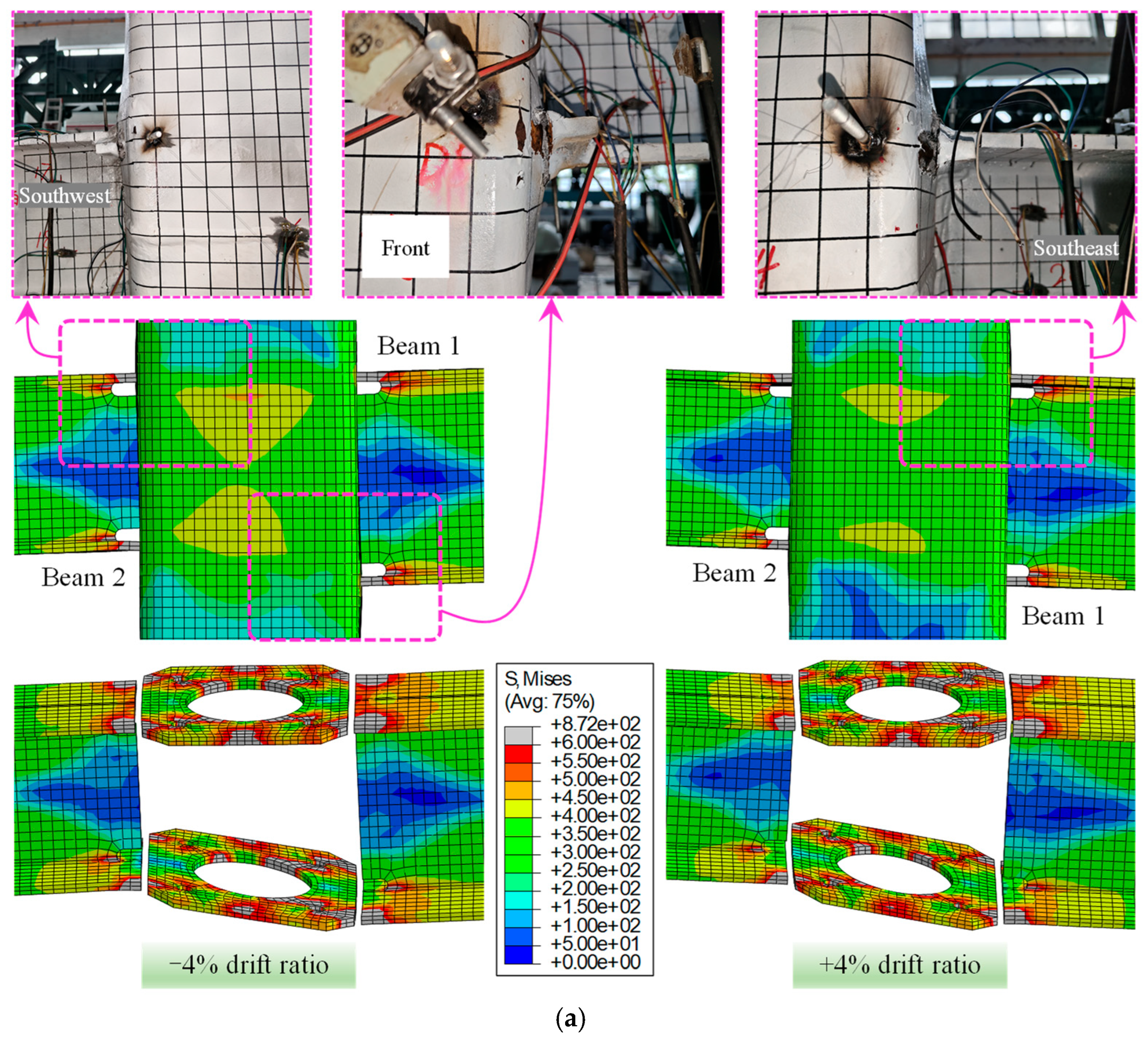 Overall, both joint configurations demonstrate that IID plays a pivotal role in controlling the stress transfer path and deformation capacity of the connection. The panel zone yields first, followed by the beam flanges that accommodate most of the plastic deformation. Once the welded diaphragms fail, additional tensile strain develops in the column wall, accelerating damage propagation and ultimately governing the overall failure of the joint.