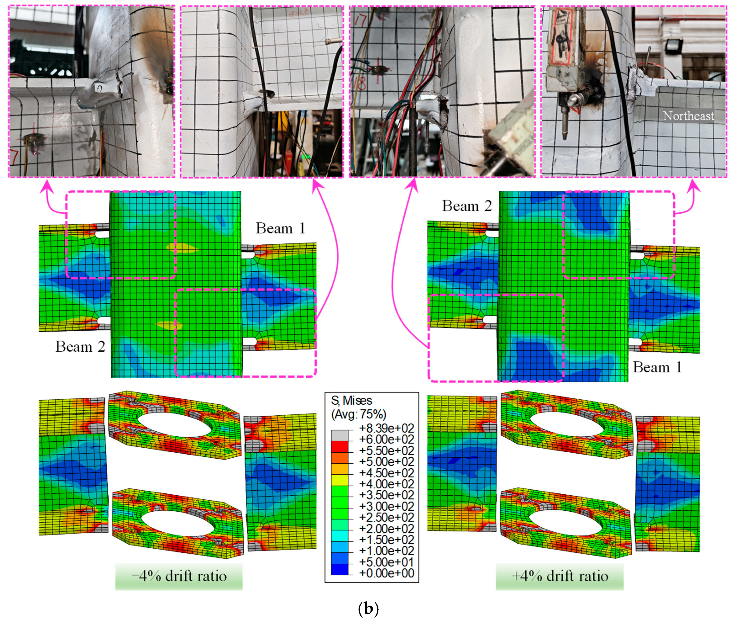 ηbc > 1.0 or when the diaphragm opening is oversized, the local load-bearing capacity of the connection decreases significantly, and fracture of the diaphragm or tearing of the column face becomes more likely under cyclic loading. In addition, recent studies have examined cyclic deformation and failure mechanisms in steel frame systems, offering broader insight into stress transfer and joint behavior under seismic actions [