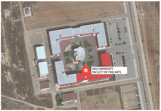 Afyon Kocatepe University, which is the study area, was established in 1992 in Türkiye and has 31,520 students and approximately 2000 academic and administrative staff since its establishment. It continues its educational activities with 13 faculties, 3 institutes, 3 colleges, 1 state conservatory and 14 vocational schools [27]. The Faculty of Fine Arts, where the study was conducted (Figure 1), is located on the Ahmet Necdet Sezer Campus of Afyon Kocatepe University. The faculty comprises the Departments of Interior Architecture and Environmental Design, Cinema and Television, Ceramics, Painting, and Traditional Turkish Arts. Figure 1 illustrates the location of the faculty within the campus and its spatial relationship with the surrounding buildings.