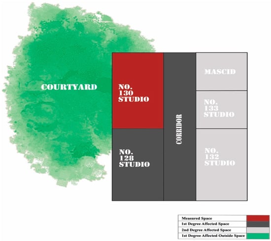The Faculty of Fine Arts, with 1123 students and 55 staff, shares a common courtyard with the Faculty of Technology and the State Conservatory, bringing the total number of users in the area to 2811. The study was conducted in Studio 130, a space belonging to the Department of Interior Architecture and Environmental Design (Figure 2). This studio was selected as the study area because design studios are central to the department’s pedagogy and include courses related to acoustics. Studio 130 was specifically selected as the case study due to its direct exposure to courtyard noise, frequent use for group critiques and jury sessions, and significant external sound leakage from window joints despite its aluminum composite façade. The space lacks a dedicated ventilation system, features plaster-mounted lighting fixtures, and experiences additional noise from students’ computers during studio hours.