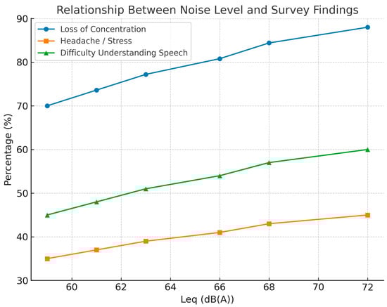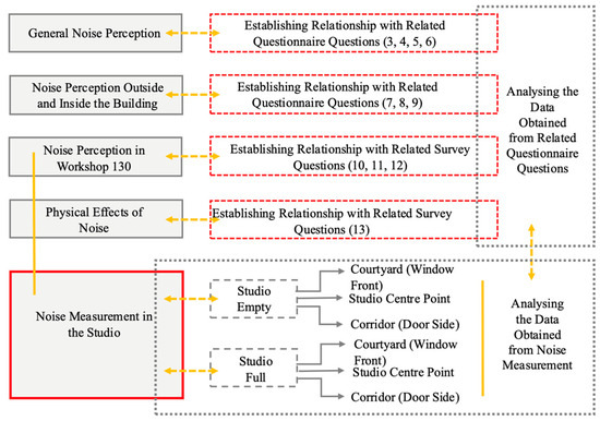 The questionnaire used in this study was developed based on previous research in the literature [39,50,51], and adapted to the design studio context. It consisted of 5 sections and 15 items in total. The first section included demographic questions (e.g., gender, year of study), while the second section assessed students’ discomfort due to noise. The third and fourth sections focused on the perception of noise within the building and its surroundings, and noise specifically within the design studio. The final section addressed the perceived disturbing effects of noise on learning. Example questions include: “To what extent do you find the studio environment noisy during classes?” and “Does noise negatively affect your ability to concentrate or participate in group critiques?”. The questionnaire employed a 5-point Likert scale (1 = strongly disagree, 5 = strongly agree). The study protocol was approved by the Afyon Kocatepe University Social and Human Sciences Scientific Research and Publication Ethics Committee (Decision No. 2024/316). The survey results were then cross-analyzed with the noise measurements to establish correlations, as illustrated in Figure 5.