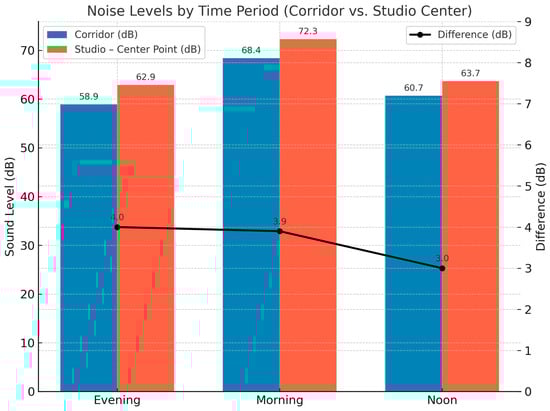 The main contribution of this study is to demonstrate that noise levels in studio environments frequently exceed the 35 dB(A) limit recommended by the World Health Organization for classrooms, thereby negatively affecting speech intelligibility, concentration, and collaborative learning processes. Unlike shorter-term and classroom-oriented studies, this research highlights the specific conditions and challenges of critique-based studio education. A key novelty of the study lies in its dual-method approach, combining 14 weeks of continuous, standards-compliant noise measurements with student perceptions, and contextualizing these findings through comparisons with international data from classrooms, open-plan offices, and studio environments. This integrated approach provides a more comprehensive understanding of how noise impacts learning performance in design-based education. Furthermore, the proposed interventions (partition elements, ceiling treatments, flooring solutions) offer not only spatial adjustments but also practical guidelines aimed at enhancing learning efficiency and improving acoustic comfort.