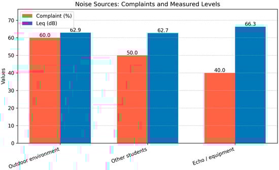 Second, the measurements and surveys were carried out within a specific 14-week period and with a limited student sample, which constrains the temporal and demographic breadth of the dataset. Third, although the survey instrument was adapted from previous research, reviewed by experts for content validity, and demonstrated strong internal consistency (α = 0.87), it is not an internationally validated scale; therefore, the interpretation of the findings should take this methodological limitation into account. Additionally, certain external factors—such as fluctuations in outdoor noise associated with meteorological conditions—could not be fully controlled during the measurement period.