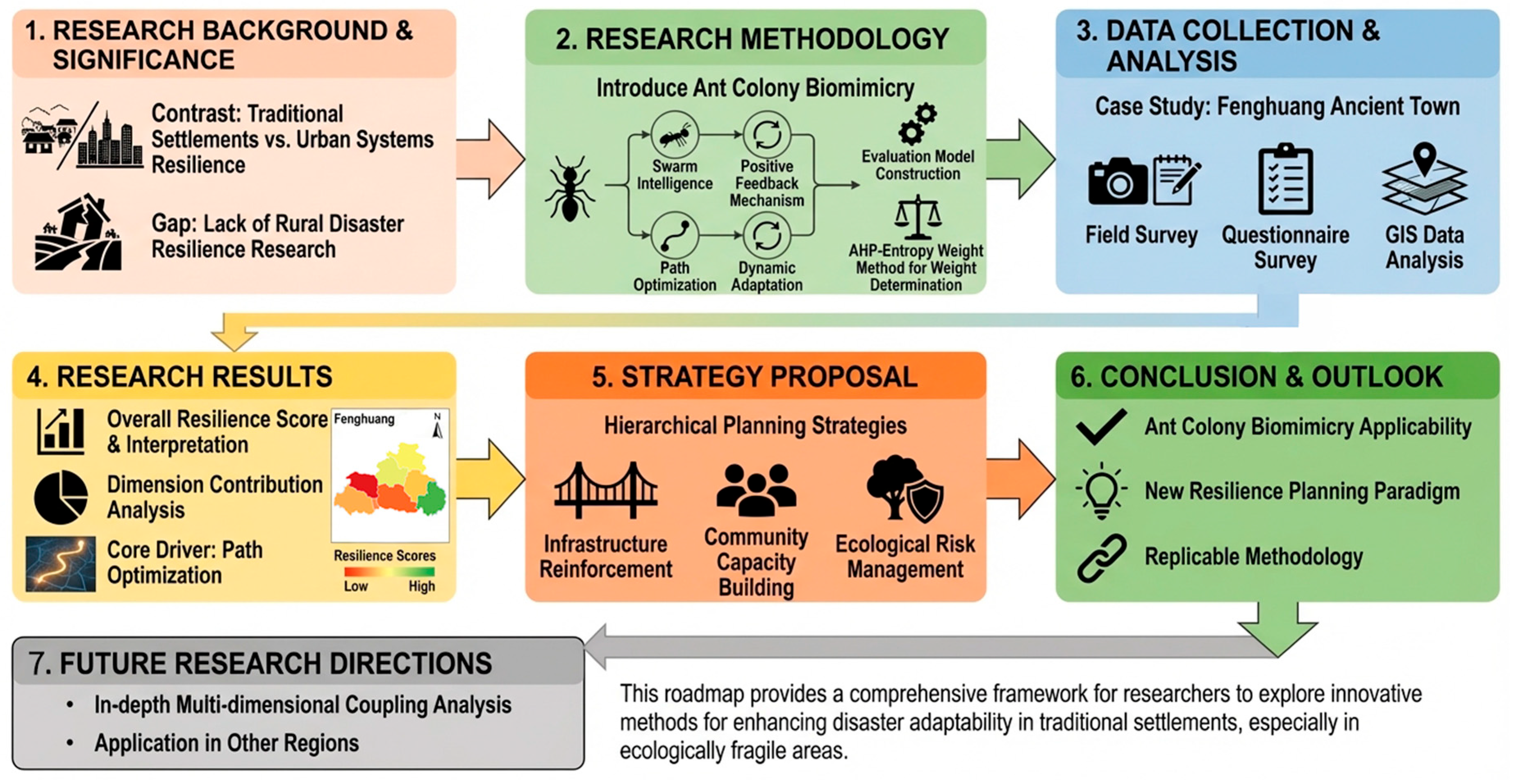 Based on this theoretical synergy between colony intelligence and resilience, this study introduces principles from ant colony biomimicry, treating ant colonies as intelligent, self-organizing system models. Four core characteristics are extracted from this framework, which are then applied to deconstruct, reorganize, and reinterpret the traditional settlement disaster resilience evaluation system. This yields a systematic evaluation method for traditional settlement disaster resilience, supporting national strategies for rural revitalization and cultural heritage preservation. This research provides an innovative methodological framework for the quantitative and dynamic assessment of rural system resilience, as shown Figure 1.
