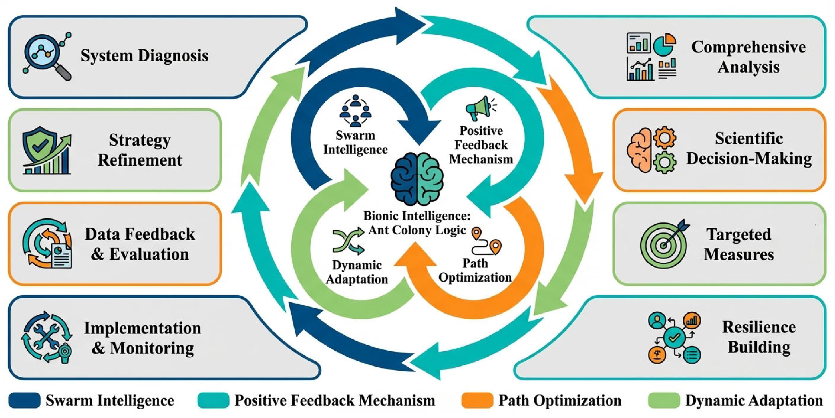 As illustrated in Figure 2, the identification of resilience indicators under this framework follows a complete operational cycle. It begins with a systematic diagnosis of core issues, including weakened traditional adaptive capacity, prominent disaster risks, and insufficient governance capability. Through comprehensive analysis, a resilience enhancement mechanism is activated. This process informs scientific decision-making and leads to targeted intervention measures, ultimately driving the system toward continuous updating and reinforcement through a virtuous cycle. Thus, the algorithmic logic of ant colony intelligence is embedded organically into the entire resilience-building process.