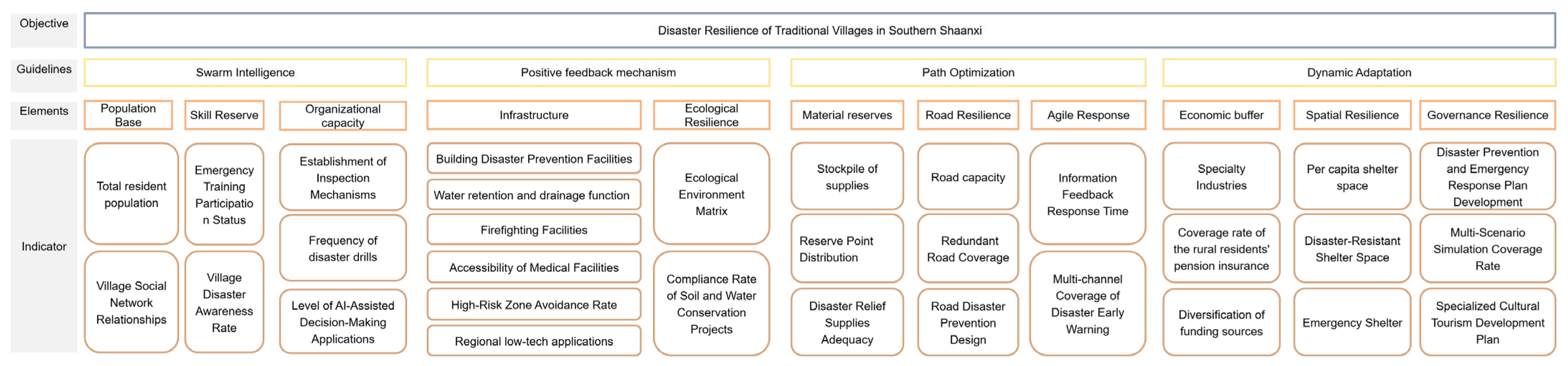 Based on the theoretical framework of the aforementioned ant colony-inspired resilience evaluation model, this study constructs a four-tier disaster-resilient evaluation indicator system comprising the objective layer, criterion layer, factor layer, and indicator layer, as shown in Figure 3. This system aims to translate abstract biomimetic principles into quantifiable and operational evaluation tools.