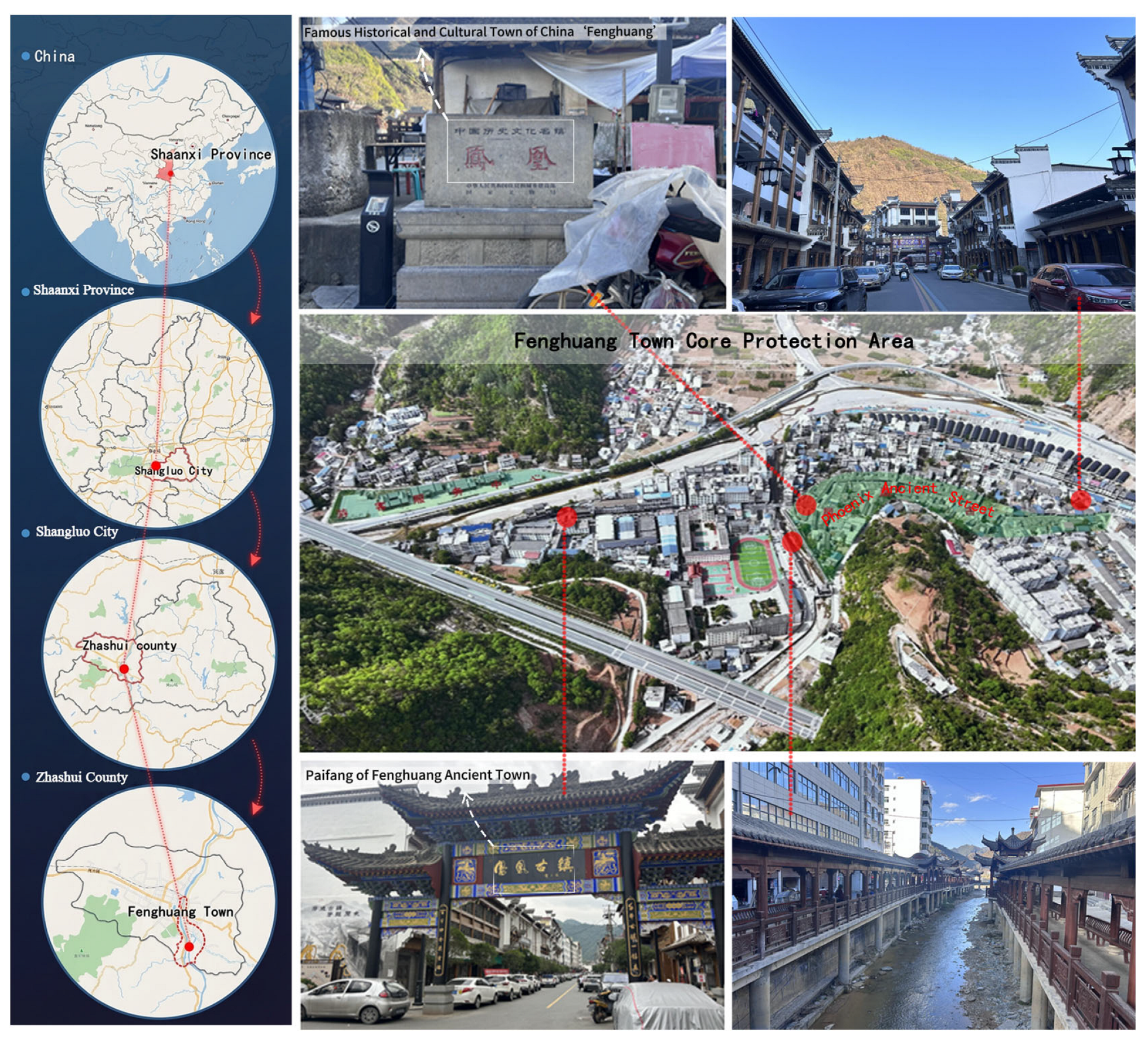 This study focuses on Fenghuang Ancient Town because it embodies typical tensions and broad relevance in its responses to natural disasters. Situated at the confluence of multiple rivers on the southern slopes of the Qinling Mountains, the town has long faced threats from geological hazards like flash floods and landslides, as well as meteorological disasters. Its traditional “cross-water” spatial layout and architecture reflect biomimetic wisdom and inherent resilience, illustrating how rural societies adapt to hydrological conditions. However, rising extreme weather events and rapid tourism growth require the town to balance upgrading disaster-prevention facilities with preserving its historical character. It must also navigate tensions between tourism-driven change and the continuity of local traditions. These challenges make it a site for observing the multiple tensions between “traditional dis-aster-adaptive wisdom and modern disaster prevention needs” and “heritage preservation and community development”.