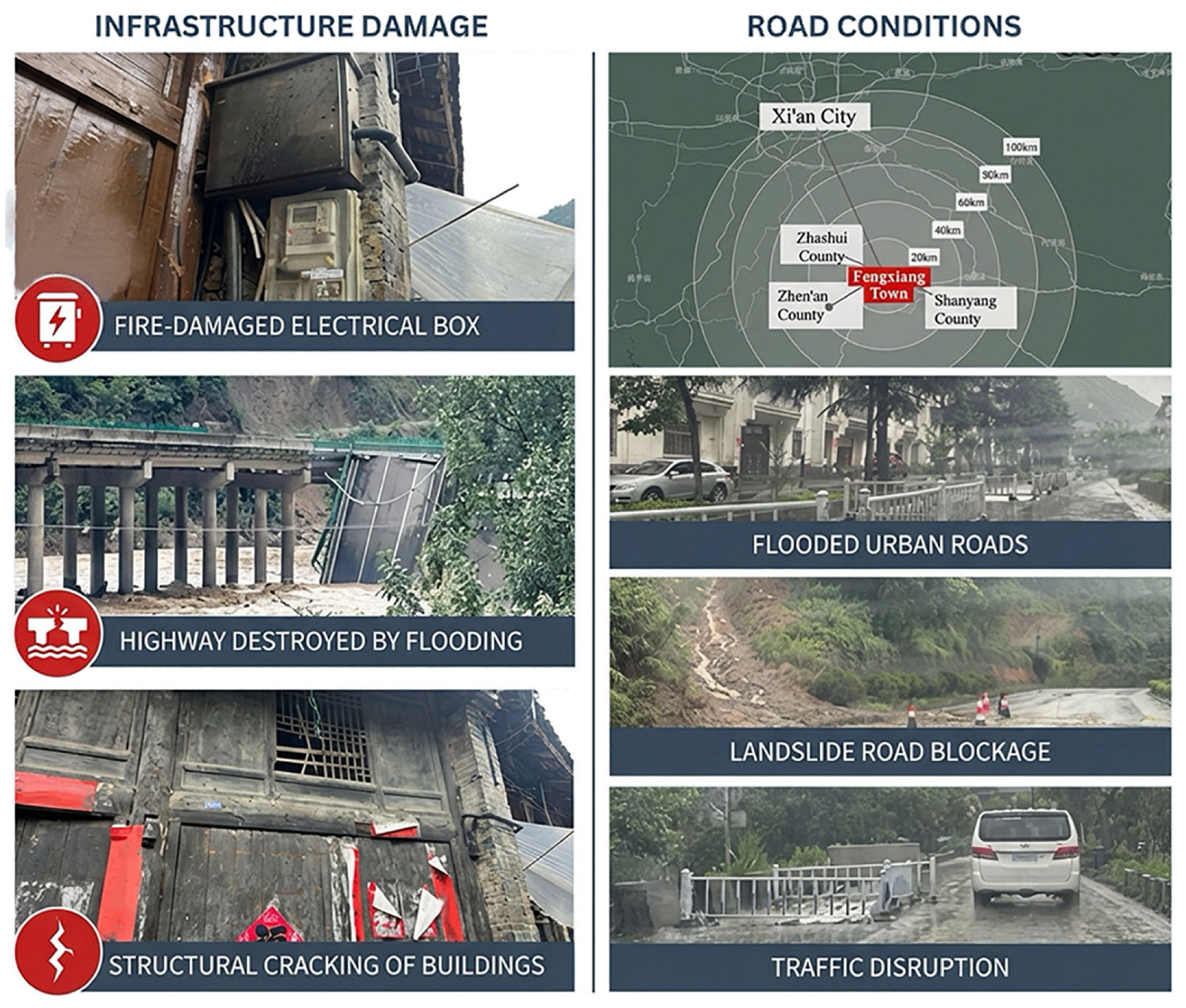 The ancient town complex is situated in a high landslide-prone area of southern Shaanxi. Its geological structure is dominated by Middle and Upper Devonian and Lower Carboniferous strata, exhibiting characteristics of conglomeratic sedimentation. The surface is covered with a 5~8 m thick layer of loose accumulation, which is highly prone to triggering debris flows under heavy rainfall conditions. Records indicate that severe flooding occurred in this area in 1937, on 18 June 1940, and on 6 August 1963. The 1963 flood reached depths of 1.6 to 2.3 m, resulting in the complete loss of crops. On 22 March 1966, an earthquake struck, causing buildings to collapse and claiming 37 lives. This event stands as the most destructive natural disaster recorded. A man-made fire on 2 May 2016, which destroyed six Ming and Qing dynasty ancient buildings, also highlights the need to address human-induced risks during modernization. After the 1930s, with the decline of water transport and the development of road traffic, Fenghuang Town gradually faded into obscurity in the deep mountains. In 2006, the opening of the then-longest tunnel in Asia shortened the distance from Xi’an to Zhashui to 65 km, and the urbanization process gradually impacted its original disaster-adaptive resilience system. In addition, the surrounding areas are more concentrated in coal mines and other heavy industries, a large number of heavy trucks frequently transit the countryside due to transportation needs, and long-term overloading has led to serious damage to rural roads, further exacerbating the deterioration of traffic conditions, which not only affects the efficiency of residents’ daily travel and emergency relief (Figure 5) but also poses a continuous threat to the settlement’s physical space and ecological resilience.