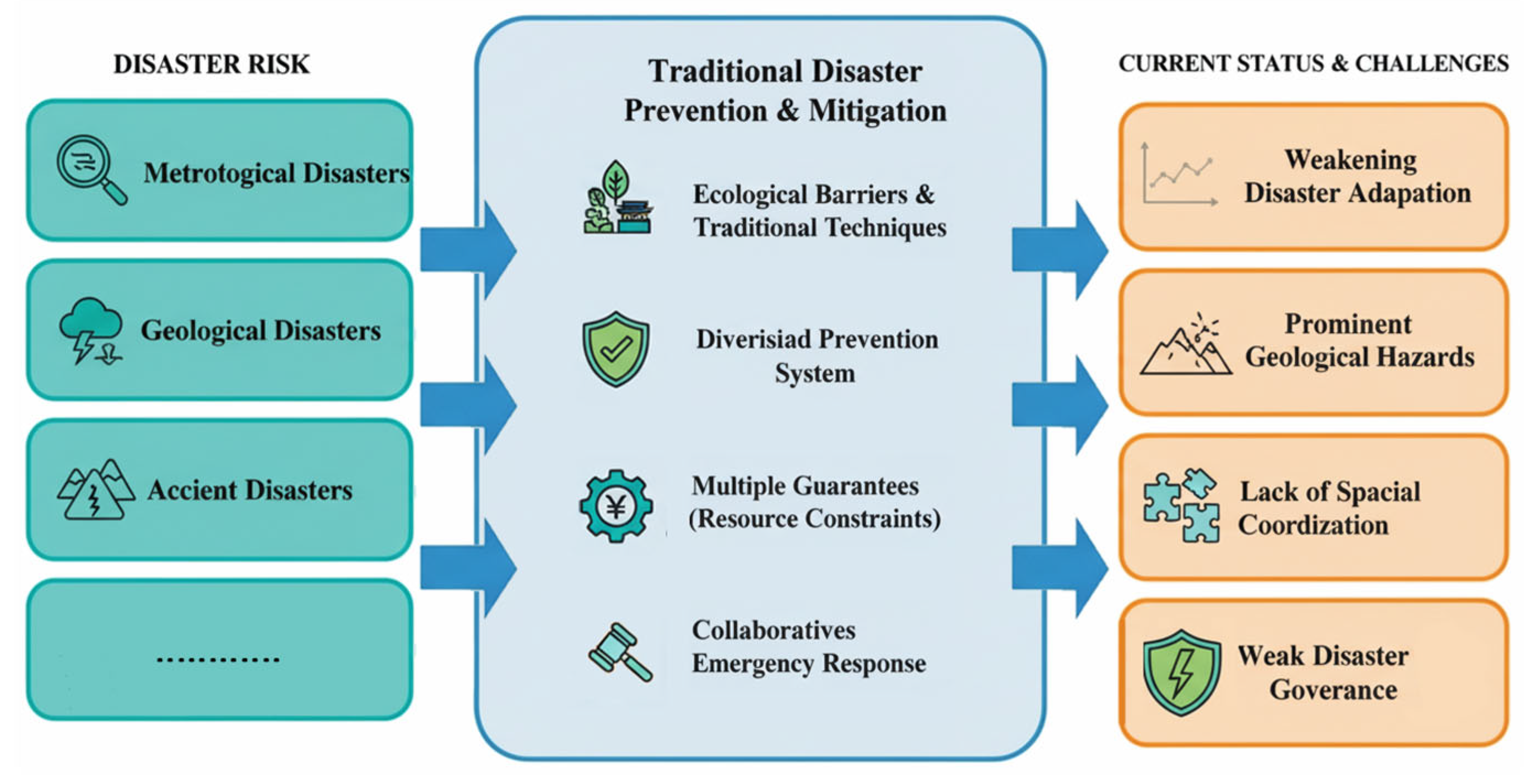 China’s unique geographical location, intense crustal movements, mountainous terrain, and unstable monsoon climate constitute a complex, regional disaster-prone environment [1]. The disaster situation in villages is particularly severe, characterized by diverse types and clustered occurrences, posing serious threats to people’s lives and property. These areas are often repositories of precious historical and cultural heritage, yet their physical spaces and environmental systems exhibit significant vulnerability. Traditional settlements maintain a close connection with historical and cultural heritage, encompassing multiple dimensions such as anthropology, sociology, cultural diversity, and local customs. They also bear rich tangible and intangible cultural heritage. This heritage not only serves as a historical testament to over two millennia of rural culture and embodies its artistic value, but also shoulders a vital mission in preserving regional cultural identity and mitigating global cultural homogenization [2]. In this context, the construction of disaster prevention and mitigation capabilities for traditional settlements has become a core concern for their sustainable development, and the concept of “resilience” has gradually become a central orientation in the fields of urban and rural planning [3]. Therefore, enhancing the disaster resilience of traditional settlements is not only an urgent necessity for safeguarding the safety of rural living environments, but also a key pathway to achieving the goals outlined in the report of the 20th CPC National Congress of the Communist Party of China: “promoting rural revitalization and enhancing the nation’s cultural soft power” [4].